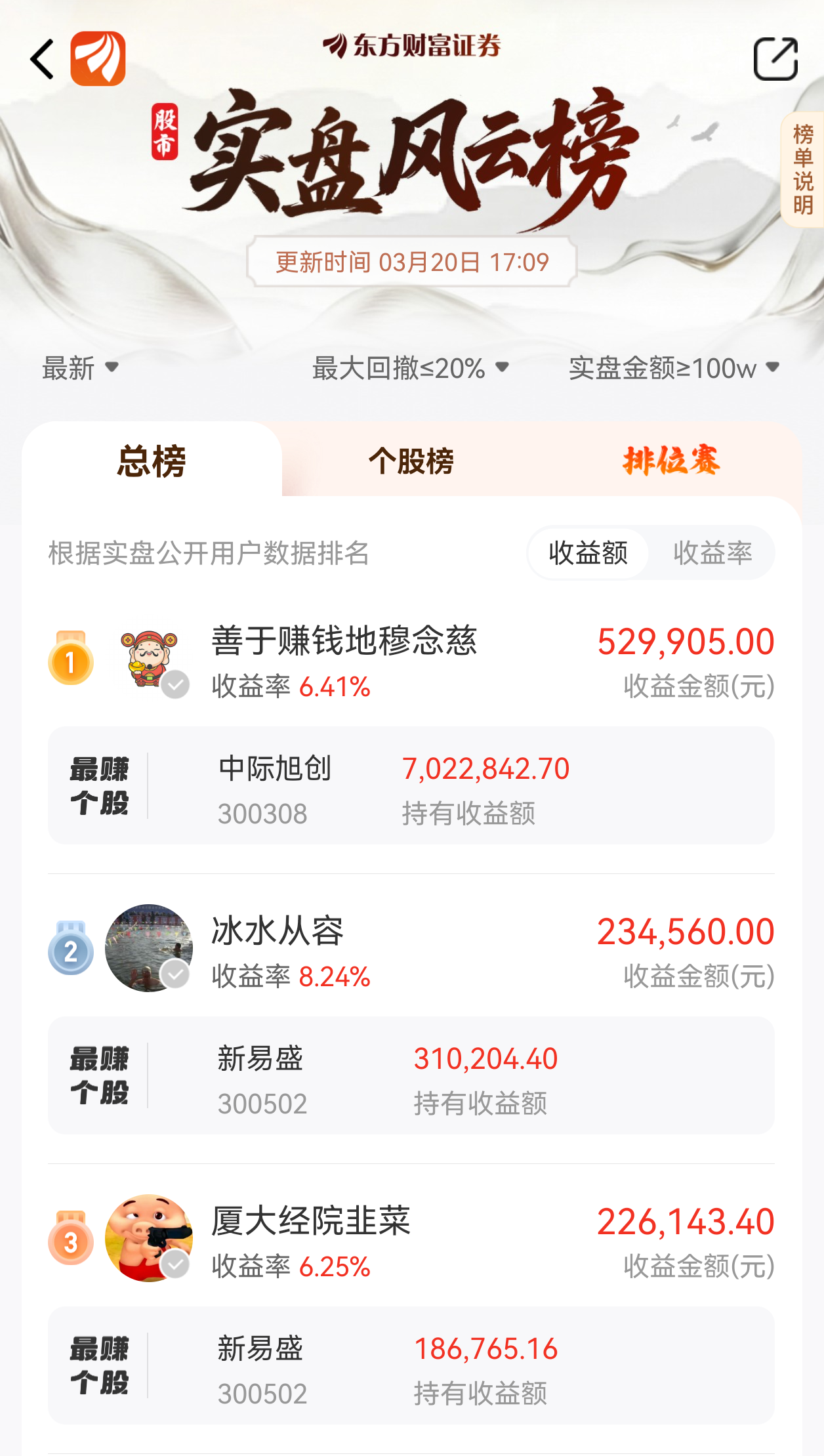 东财实盘榜上,神秘高手们又是如何应对当下行情,下周是否能够抄作业呢?最新收益额榜前三名如下: