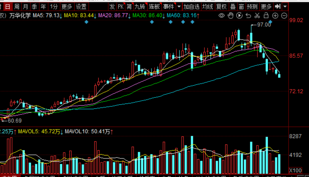 万华化学放量下跌,周线正式回踩20日线
