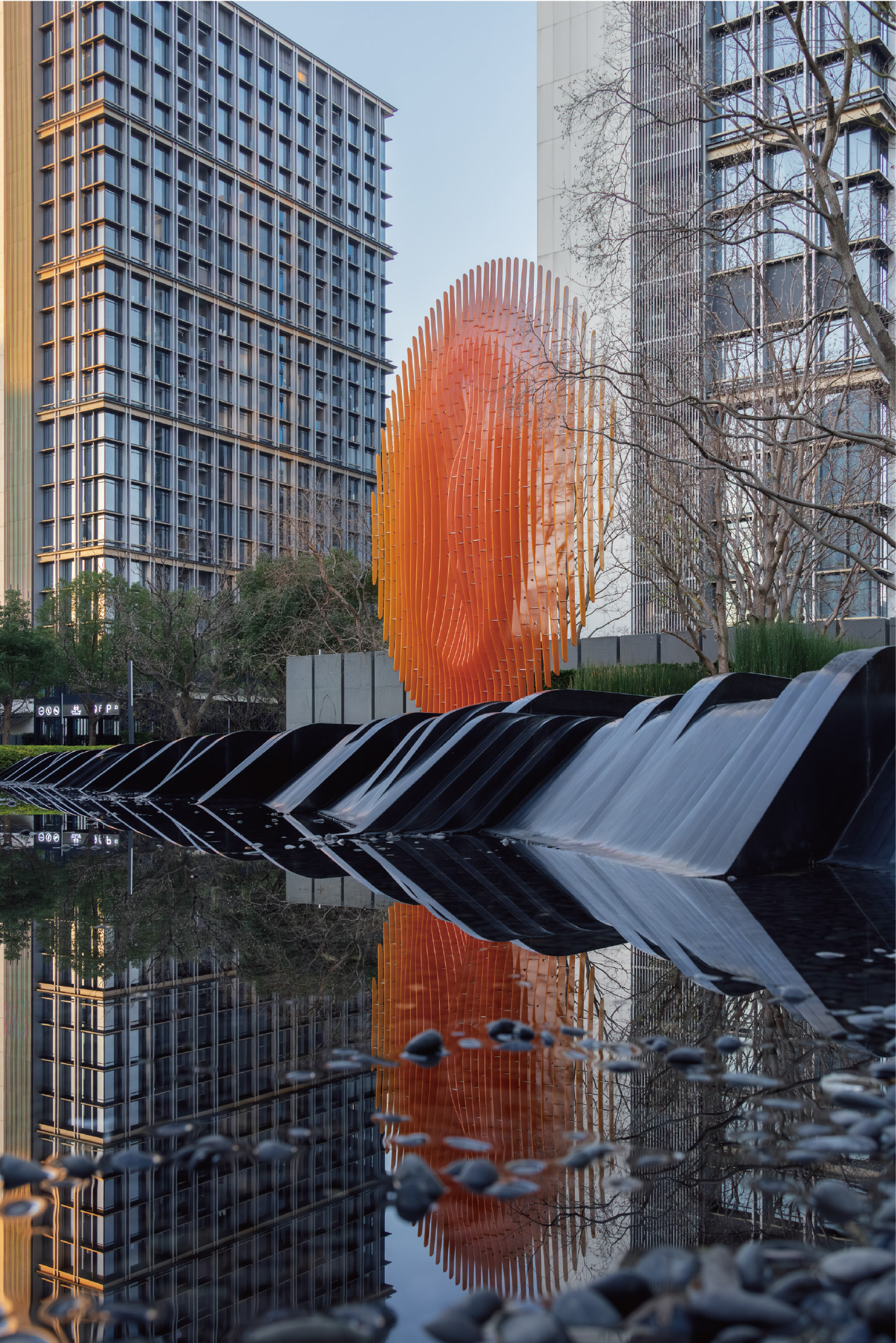 《日出东方》以宏阔体量迎向城市界面,是一场关于光与启始的公共仪式;《黄浦游龙》则隐身于归家动线,是关于流动、安宁与亲密的日常叙事。两者并非独立存在,而是与景观、建筑、人的移动路径共同形成一张彼此支撑的关系网络。