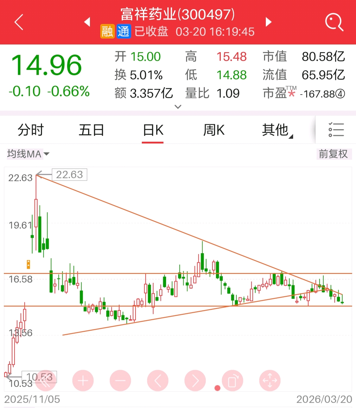$富祥药业(SZ300497)$ 富祥药业下周一走势非常关键,3个点位尤其重要:14.74,15.4,14.98。理由如下:1.假如补跌破14.74支撑,那么就要去考验13.7的支撑有效性,这个位置强支撑大概率不会跌破。2.如果周一打到14.7反身向上,就必须看15.4是否能能有效站上(这个点位是22.63高点下来的反压线),站上去下跌趋势被扭转,第一目标位还是16.7。3.周线看14.98是12.26号这根大阳线的半分位,也就是看股价调整强弱的一个指标,之前6次收盘没有跌破,今天收盘已破同时20周均线也被跌破,所以下周必须站稳15.4以上,富祥还有的玩。否则大家洗洗睡吧![上涨 [上涨]](http://gbfek.dfcfw.com/face/emot_default_28x28/emot78.png)