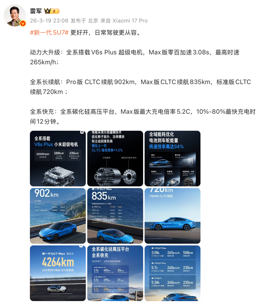 高盛分析,新款改款车型配置升级导致原材料成本增加 2 万元以上,小米可通过零部件成本优化、制造效率提升及规模效应对冲成本压力;新一代 SU7 标准版和 Pro 版性价比与配置显著提升,初期过后 Pro 版有望成为最畅销版本,SU7 Max 初期消费者权益强劲,有望提升初期订单占比;新款发布后前 34 分钟获 1.5 万辆确认订单,增速超第一代 SU7;随着产能与交付政策升级,叠加老车主优先排产,订单表现将更平稳。