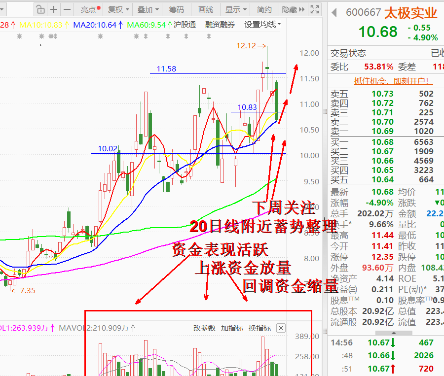 太极实业600667是半导体封测 + 高科技 EPC 双轮驱动标的,低位低价股的半导体概念股,从年底就有资金长线布局,这周在冲高12.12之后,短线受大盘回调探底影响,部分跟风短线资金避险离场,但短期资金进出,没有影响中长线的趋势上行,目前科技仍然是未来资金关注的方向,下周大盘探底获得支撑的话,向上回涨机会依旧存在。可以期待未来的表现。