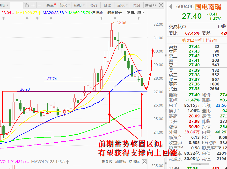 600406 国电南瑞,电网龙头,新型电力系统核心基本强,周五盘面,缩量调整,目前短期资金面缩量洗盘到前期支撑位置附近,目前在大盘探底之后,看好的资金进场会可能出现关注度提升看好的中长线业绩优秀的个股。届时盘面资金有机会增量介入之后,技术面走势就会逐步加强,再次上行,这是历史经验,资金一贯的做法。