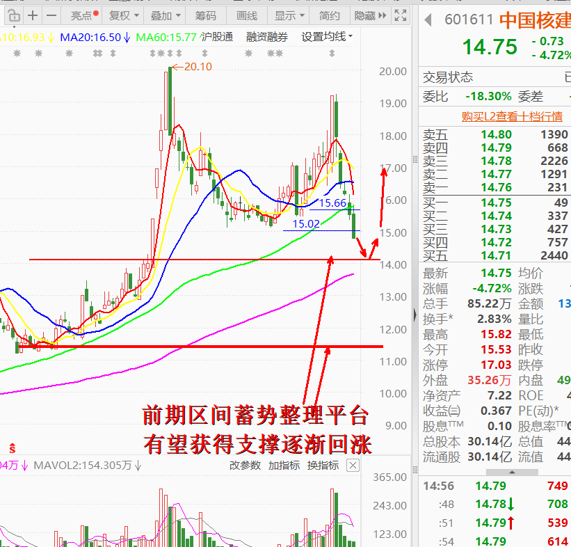 601611 中国核建国内核电建设龙头,本周资金面连续缩量下行,盘面惜售,抛压不断减少。目前调整一部分是消化前期获利盘,一方面是受大盘探底调整影响,资金暂时偃旗息鼓。下周大盘探底之后,看好的资金会积极进场低吸看好的中长线业绩优秀的个股。跟国电南瑞一样,中国核建设也是资金可以具备中长期关注价值的个股。