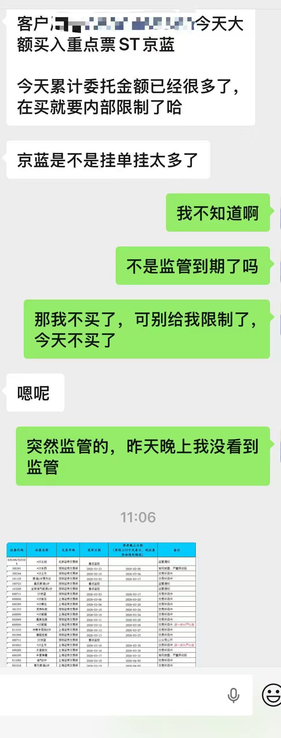 再给新手普及下:每周五交易所都会点名,上交所正平,熊猫,也被点名了,深交所点名京蓝,点名有何影响:就是交易所帮你找出了这周市场选择出来的龙头,上次京蓝也是周五被点名,结果当天9点32分就直接封板,我都没来得及上车,不信的朋友去找找我说的是不是事实....关于所有被监管中的股票:所谓的限制深交所是一分钟报单不大于200万就好,上证票会更严一点,只要一分钟买量不要太大,并且在分时成交量低的情况下不要大单连续吃掉3个档位就不会限制,而且券商限制之前都会通知你的,告诉你超额了,不会直接限制你当天买入!以下就是我今天排撤总额超过200万,券商通知我的情况,所以做龙头的老人都是见怪不怪了,进监管才是真龙,哪个龙头不是长期在监管里呆着,如果真的出监管了,兄弟们龙头就到头了都可以斩仓了!