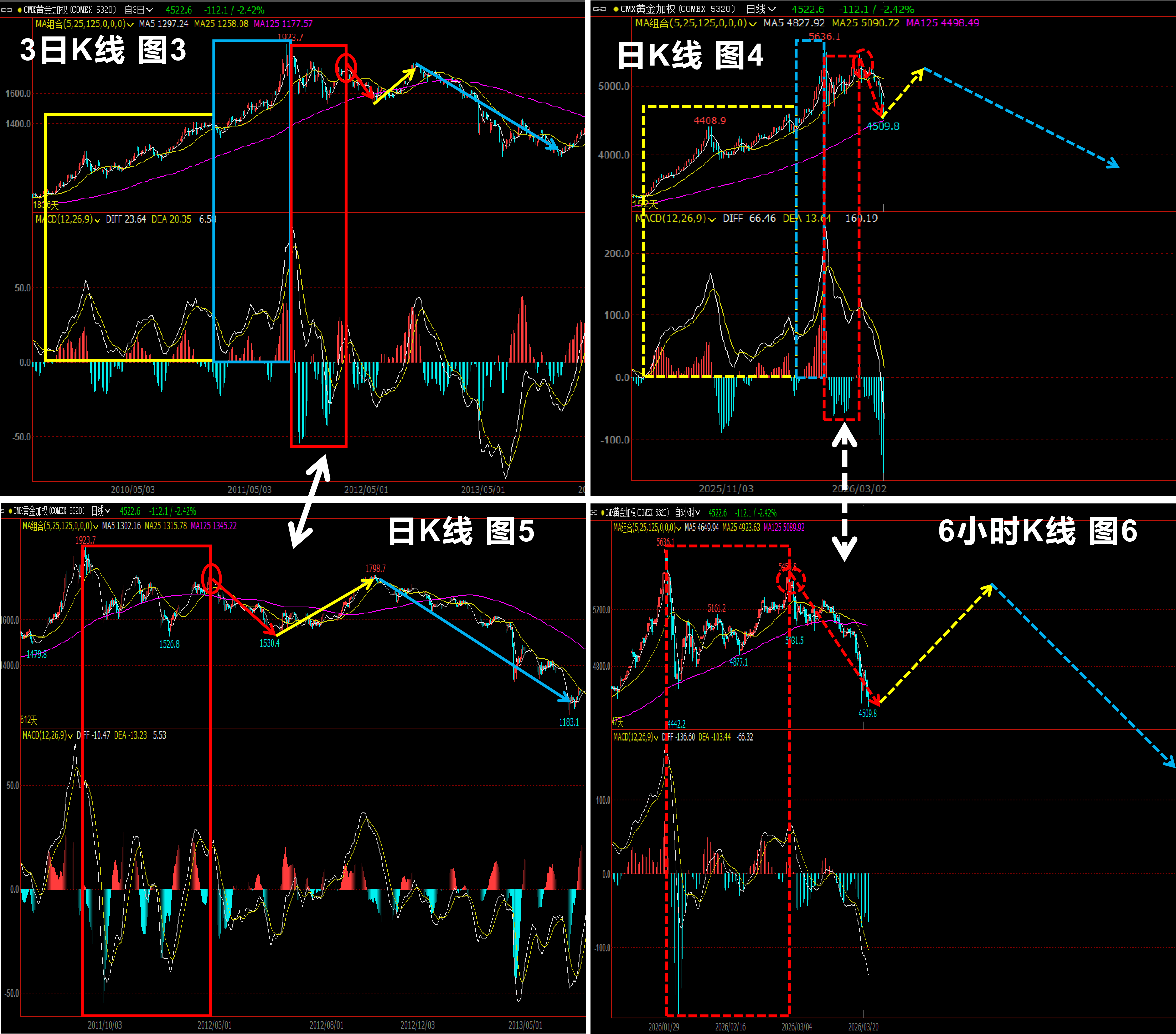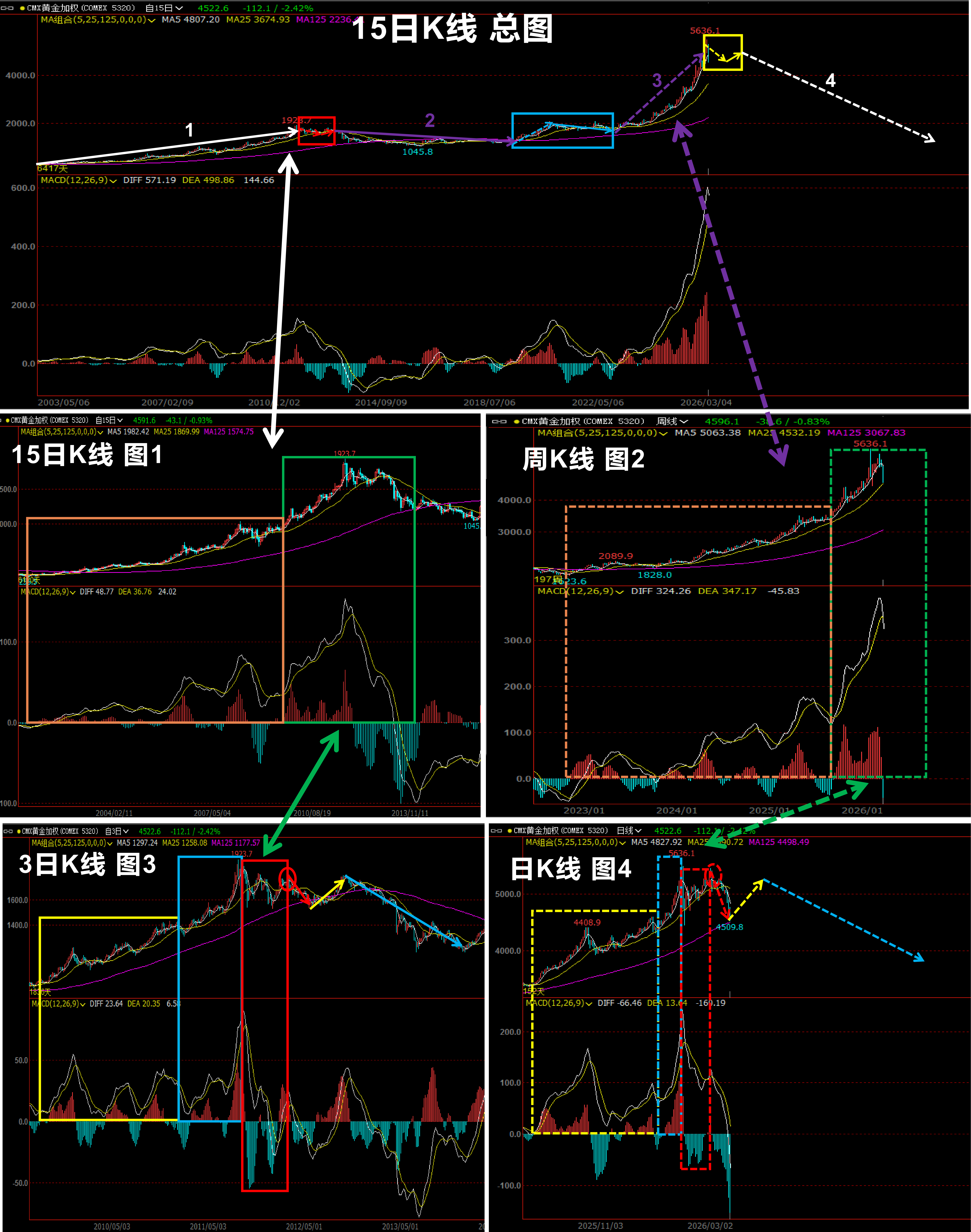 这张图片的“总图”部分,我用各色箭头和框框标注的就是黄金大级别上涨结构的运行构造逻辑。黄金的整个结构,其实就是一个四段式起伏震荡结构,白色箭头1,就是黄金的第一波上涨,紫色箭头2就是之后的回调结构,回调结束后,又展开了紫色箭头3的第二波上涨结构,目前,紫色箭头3的第二波上涨结构已经结束了,因此,黄金的大级别上涨结构已经见顶了,之后等待黄金的就是白色箭头4所标注的新一轮的大级别下跌。四个箭头,两两相对,紫色箭头2和3相对,白色箭头1和4相对。观察可以发现,紫色箭头3的上涨结构,其上涨级别是小于紫色箭头2的下跌结构的,因此,黄金的上涨出现了“顶背离”。紫色箭头2和3,方向相反,结构相似,两者级别的大小差异,代表着市场多空情绪力度和市场资金多空强度的差异。经过紫色箭头2和3的实际验证,说明了黄金的走势结构,在这两个起伏位置处,体现出来的状况就是“空方获胜”。未来,当白色箭头4的下跌回调结构全部完成后,我们就能对比两个白色箭头1和4的级别大小差异了。