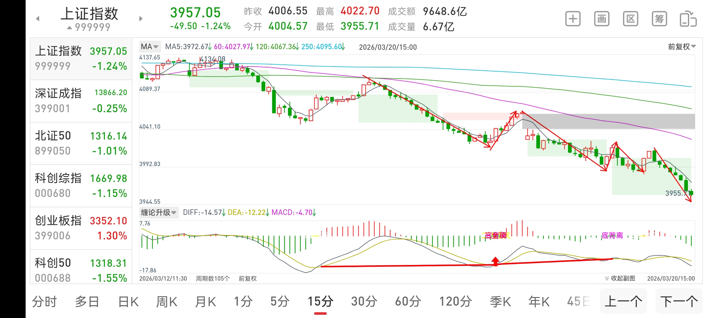根据以上15分钟走势图来看:股价跌破下行的60移动平均线,结合下方红绿柱来判断:7浪回调中,形成2个底背离结构,浪型看:多走一个回调延长7浪!形成2个底背离结构有技术性限低点不会让过多回调空间,与指数突破60移动平均线形成第二个顶背离结构成反比!再次上行一把下行的60移动平均线4027点或收盘前下行至3998点左右概率很大!