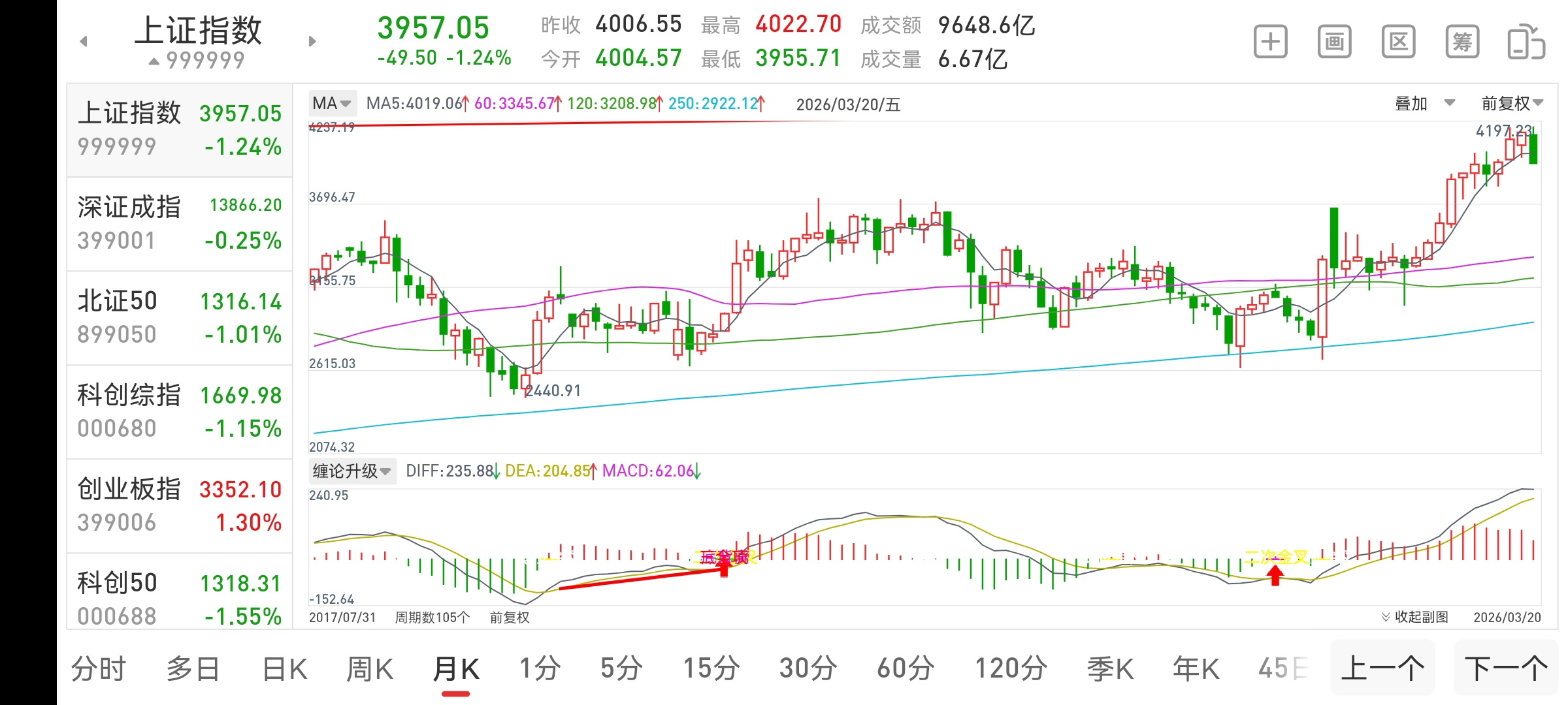 根据以上月线走势图来看:一现在看一根大阴线指数跌破5月均线4019点形成破5月均线第一根,只有跌破2根以上才能算技术性走坏!月底前还有10个交易日,只要月底前收复此点位不算跌破!二指数至月底突破60月均线上涨12根K线,极限上涨9至13根K线有技术性限高点,也符合裴波纳契数列1,3,5,8,13,21,34等变盘时间窗口期!我的观点是:4月底是月线形成第13根K线有形成阶段性高点概率很大,3月与4月上攻4200点至4300点左右概率不变!需防4月底年报与季报结束后的5至6月至7月初第二季报与半年报预告之前有大幅回调概率很大!形成26年度低点再反转结合美联储降息预期与实现上攻至年底上攻4500点整数关口与月线黄金分割线809位置4528点完成全年任务!
