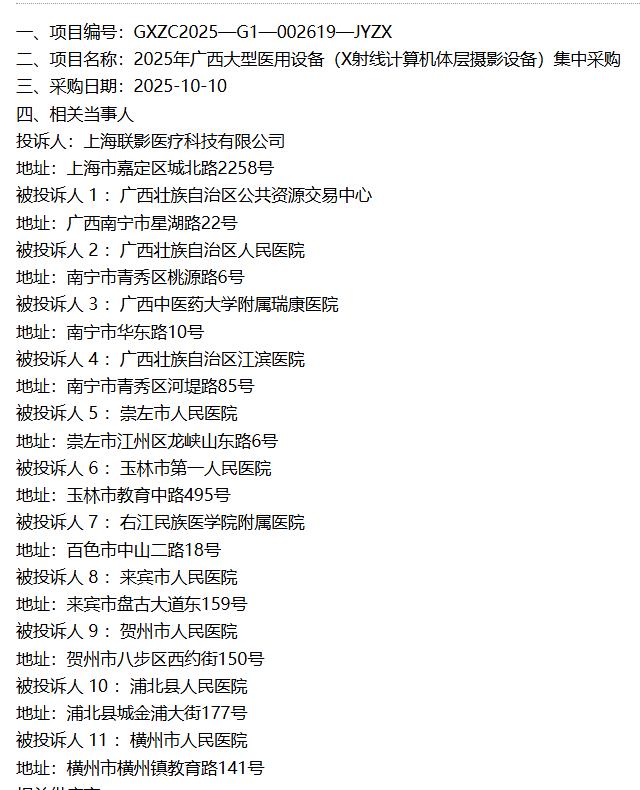 据了解,该项目为《2025年广西大型医用设备(X射线计算机体层摄影设备)集中采购》。2025年10月16日,中国政府采购网发布中标结果公告: