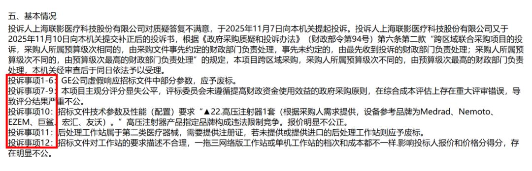 联影对质疑答复不满意后提起投诉,投诉事项共12项,主要围绕:GE医疗设备参数疑似存在虚假响应、招标文件参数可能限制竞争,以及评标过程与评分结果的公平性等问题。