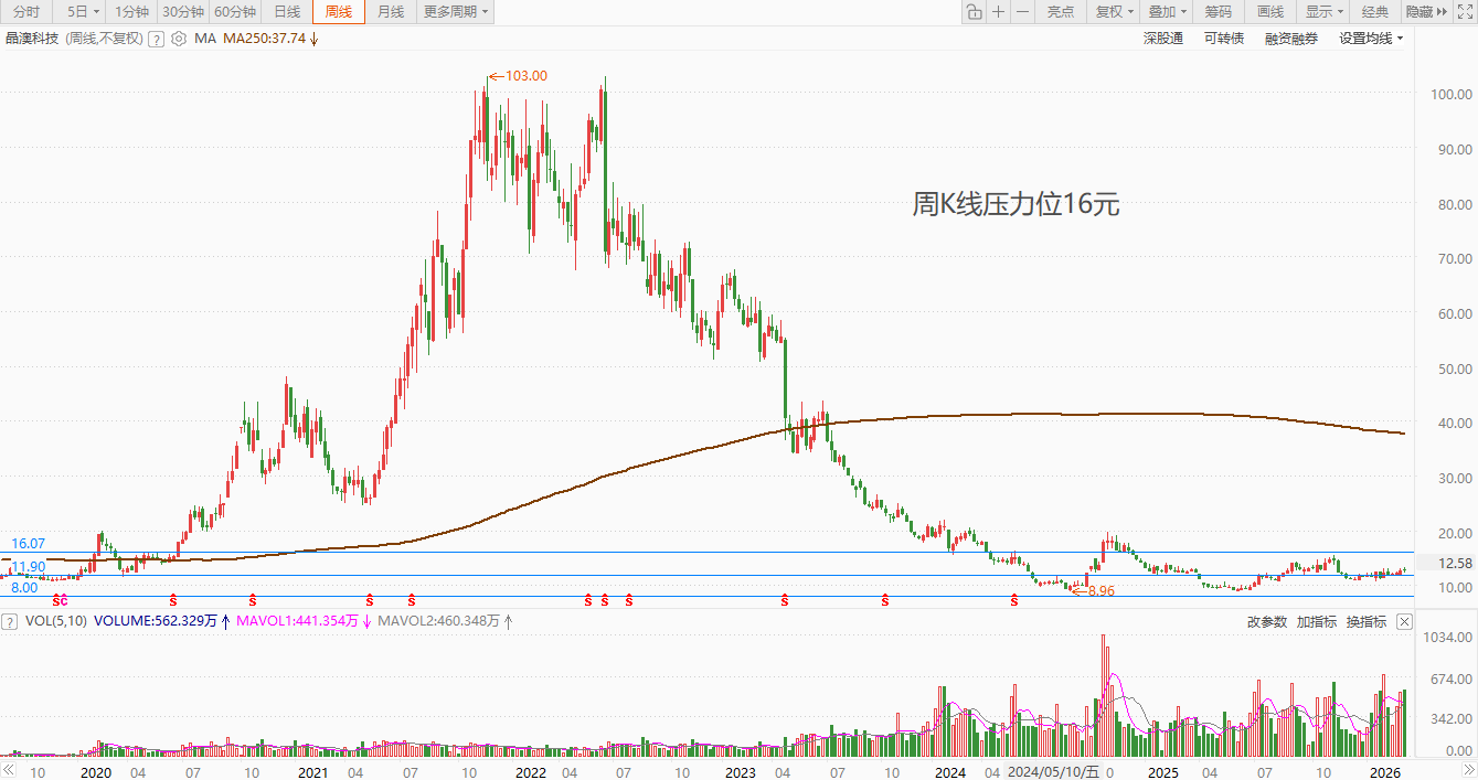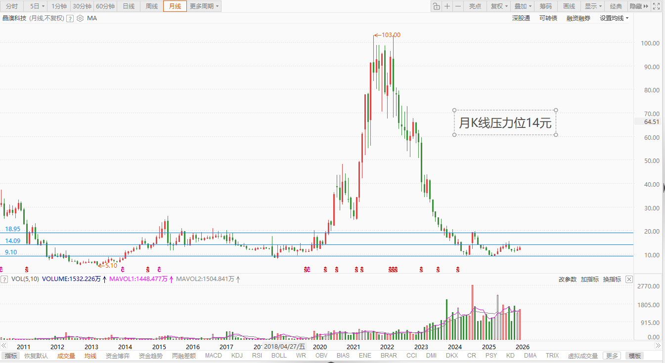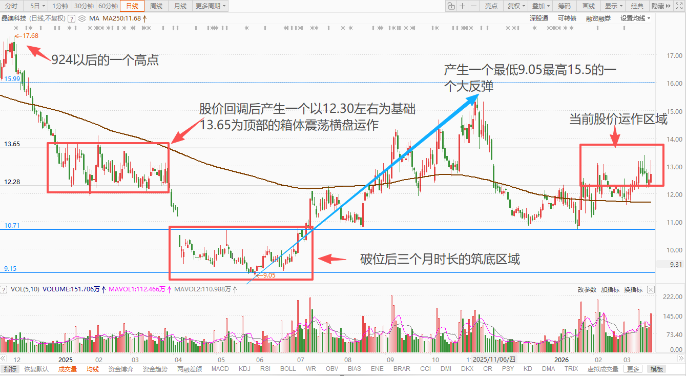 当前股价的位于在2024年底到2025年3月底的横盘震荡的区域,是经过3个月左右从10.71~12.28这个区域横盘震荡后突破上来的,如果成本处于这个区域大致是一个相较安全的成本区,15元以上的成本都算是追高成本,套牢区域在2024年底高点附近的成本,也就是17.5左右的成本区域。我们可以看到经过去年初几个月的震荡横盘和去年底今年初的几个月横盘震荡,形成一条中位线也就是12.28这条线,相对来讲最安全线应该是在10.71这条线,当股价有突破迹象时最明显的先会突破13.65元一线,继续向上那就是16元一线突破后站稳横盘震荡,那就是上台阶了,也就是为了下一个目标17元以上做准备了。逻辑也很简单但很实用,结合简单基本面的话,晶澳科技是业绩是大幅度亏损的,那么2025年的年报将会很重要,年报是和2026年一季报同时公告的,所以目前主力还是会以震荡吸筹为主。结合2025年三季报的股东户数大幅度下降的数据,去年国庆节以后股价稍有拉升,一直到目前为止的成交量也是比较平稳的情况来分析,我个人认为筹码集中度进一步提高,鉴于业绩问题主力走行情的话会在5月以后了,以上就是我的个人思路,希望对有缘人有点用