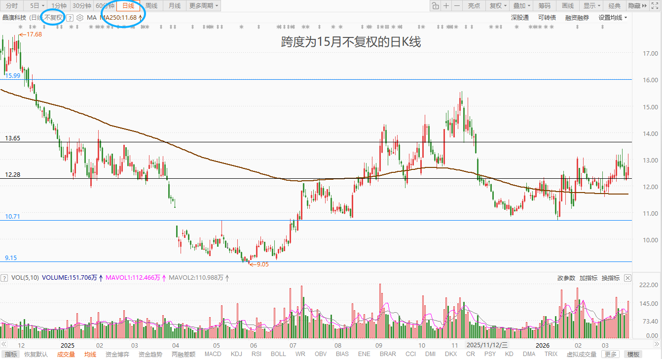 就用晶澳科技举例说明,我引用多个周期的不复权的K线,先看日线