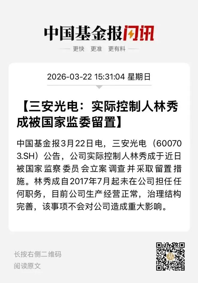 公告显示,公司于2026年3月21日收到控股股东福建三安集团有限公司的通知,公司实际控制人林秀成被国家监察委员会留置并立案调查。