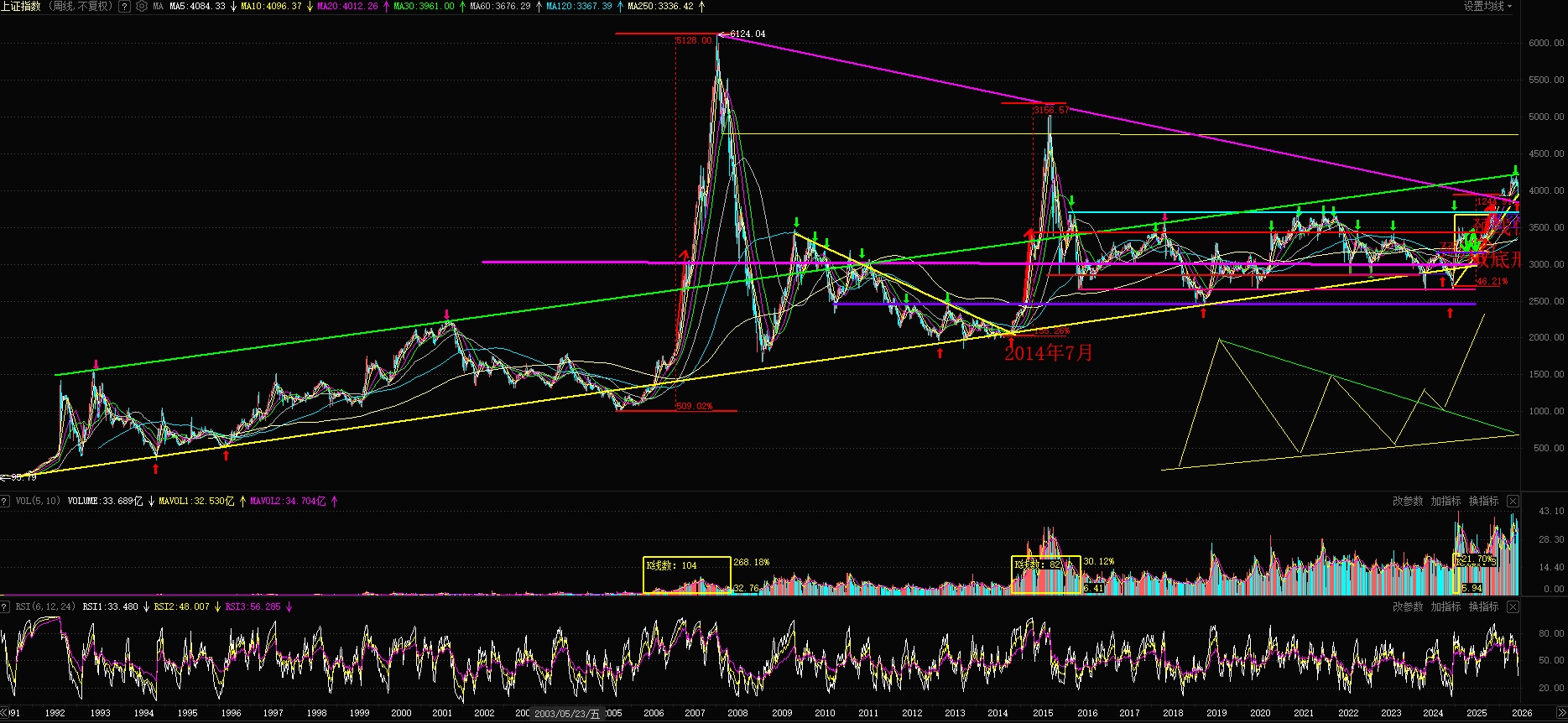 我们从纯技术角度来说,排除无形的人干预。我们上有30年运行的上干轨4200点绿线的压制,现在有二种走势,第一:向下回踩这次大型楔形突破有效性3822点,第二种极端的走法:就是回踩颈线位3730蓝色线。不管哪种情况下确认以后都是大三浪上涨的开始。