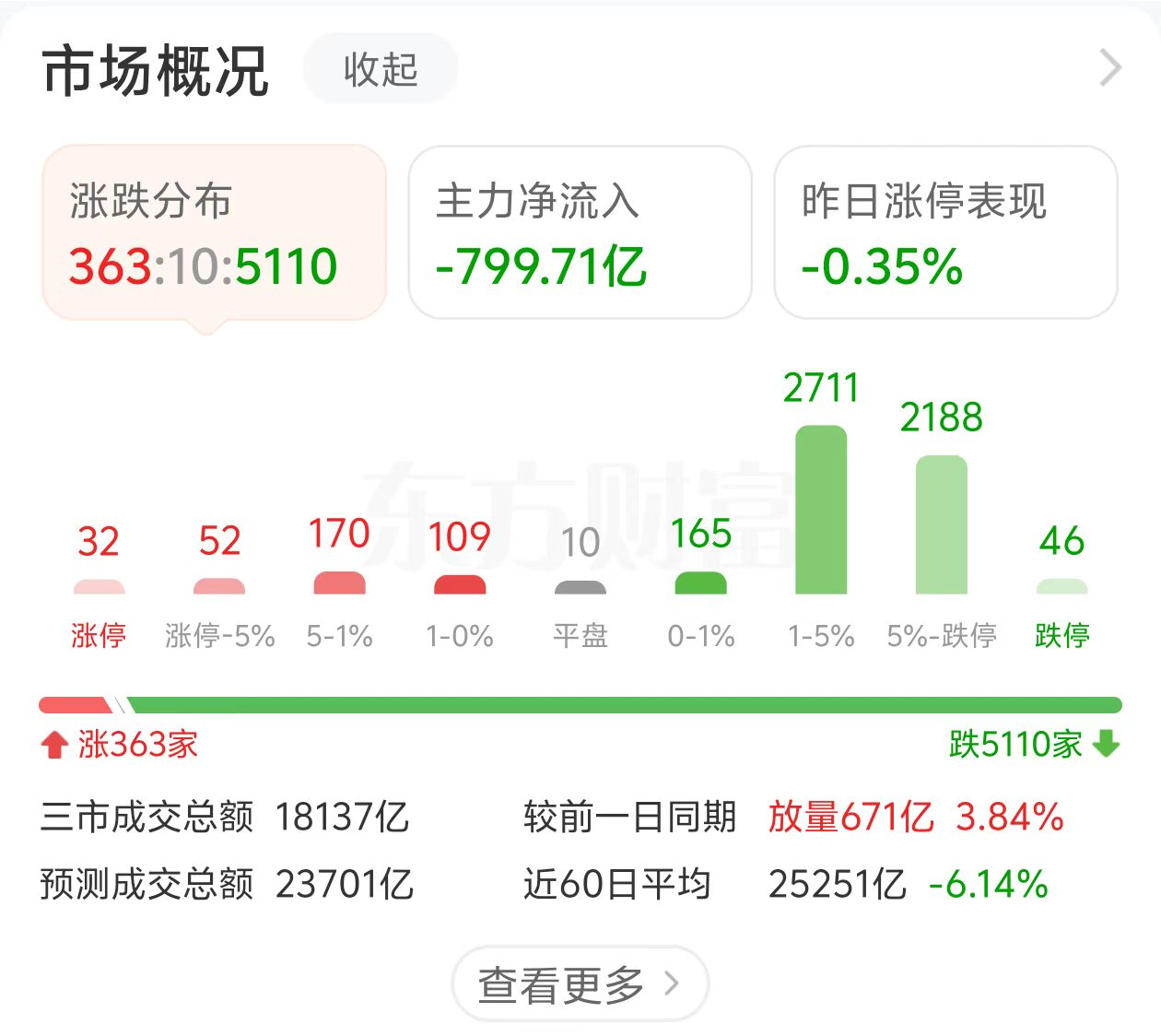 今日市场呈现普跌行情,上证大盘指数下跌3.14%,深证成指下跌2.97%,创业板指下跌2.74%。两市超过5100只个股下跌,截至1:42三市成交额18081亿元。成交额较前一日略微放量 。