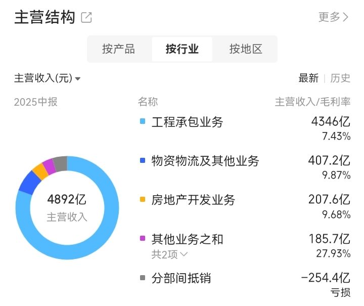 中国铁建的主营业务涵盖工程承包、规划设计咨询、投资运营、房地产开发、工业制造、物资物流、绿色环保、产业金融等多个板块。根据2025年三季度数据,公司主营业务构成如下:
