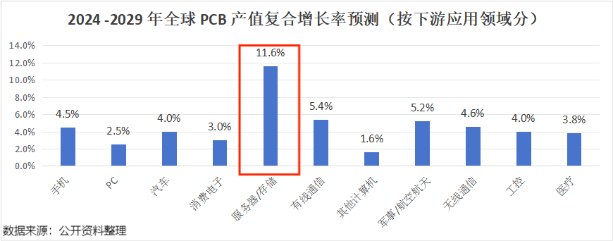 据预测,用于AI服务器、存储领域的PCB在2024-2029年的复合增速为11.6%,成为增速最快的细分应用领域。