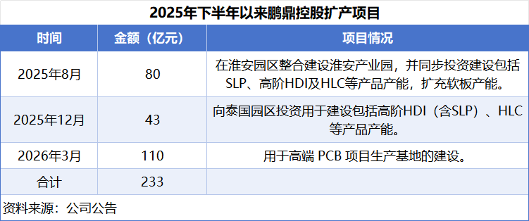 根据公告,鹏鼎控股233亿元投资均依赖自有资金与自筹资金。