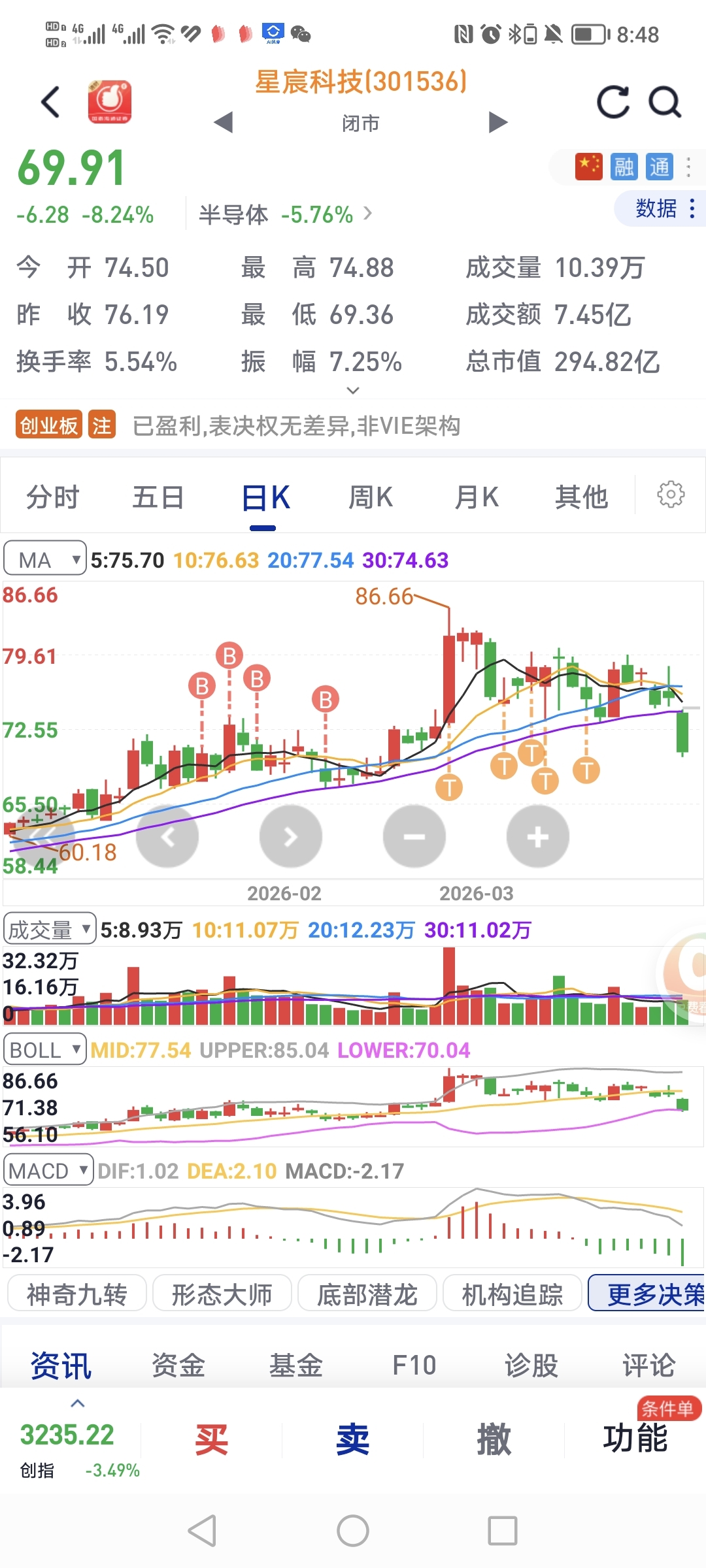 周四的帖子有提到过,半导体现在在走c浪,但是是c3主跌浪,还是c5末跌浪尚不清晰。但是今天再看,无限增加是c3主跌浪的可能性,这也是整个c浪五小浪里杀伤力最强的。今天半导体又榜上有名和贵金属领跌全场,这种层面非人为能左右。昨天想到可能会继续调整,但是想不到会是这种毫无抵抗的一路下探,这时候参考技术参考什么的,都没有太高的准星了,已经完全失真了,有人可能以为我走了,今天就不晒什么资金流向什么的了,也没有太多分析的必要,我就贴一下我还在的图给大家吧。大家要继续持有还是要暂时出来躲避战争带来的高风险,这个还是自行决定。这个时候我一直强调的成本就显得走势重要了,70以下成本,甚至60以下成本到现在还没走的,虽然也难受,但我相信这些人绝大多数都还不至于很慌乱不知所措。