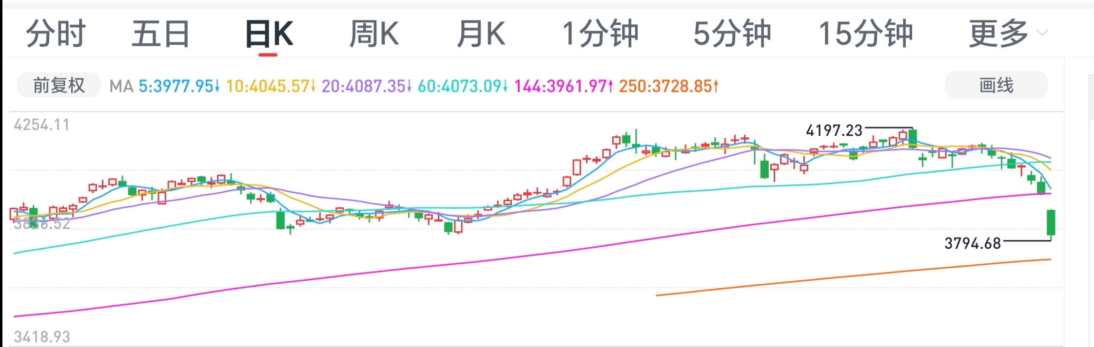 第二,今天市场留下了一个巨大的跳空缺口,三大指数低开的幅度都超过1%,上证指数低开1.32%。低开之后,上证指数盘中最大跌幅超过4%,最终收盘跌3.63%,形成了一颗放量的实体大阴线。跳空缺口,再加上实体大阴线的组合,这对于空方能量的消耗是非常巨大的。我认为今天空头情绪已经得到尽情宣泄。并且空头,今天虽然看上去来势汹汹,但实际上已到强弩之末。明天市场直接高开,反弹的概率相对较大。
