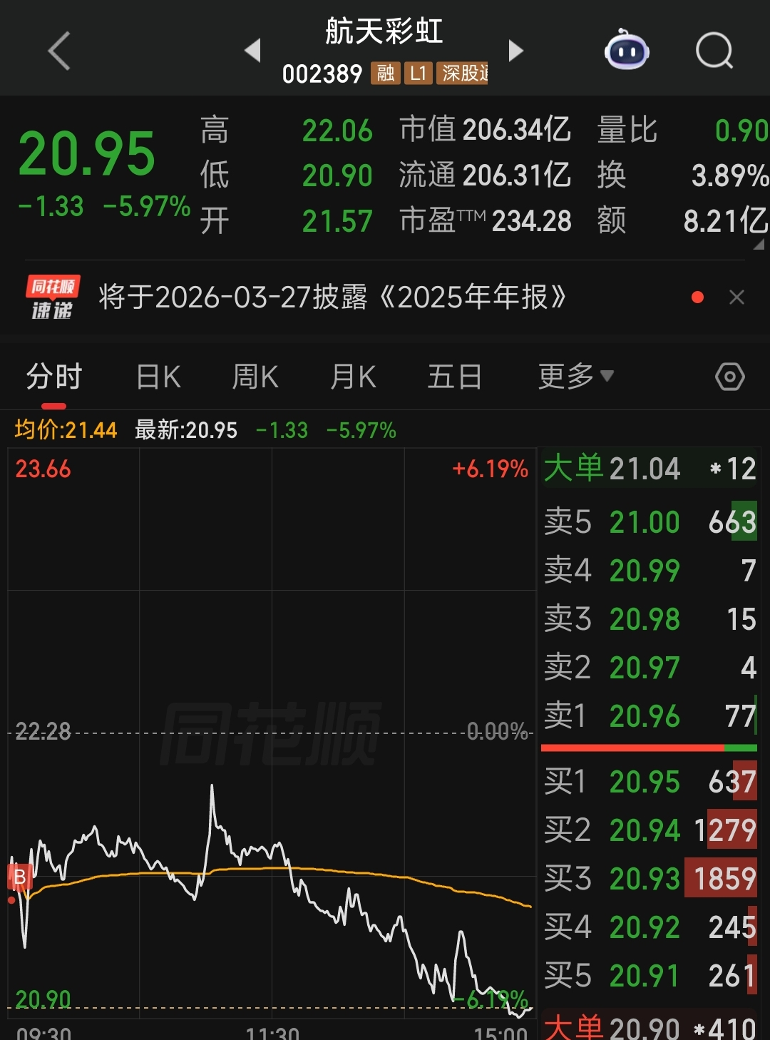 特意查了一下彩虹无人机的海外售价,已彩虹系列的“明星”出口型号的彩虹-4为例,其海外售价200万-400万美元。就算最低的200万美元,折合人民币1400万/台。现在的航天彩虹区区市值仅200亿,也就是1450台无人机的价格。更别说还有更高端的售价上千万美元的彩虹-5和彩虹-7型号。不管这次冲突结果如何,经历了俄乌冲突和这次的美伊检验,无人机在现代战争中的地位不言而喻。世界各国恐怕多少都会增加无人机的储备,这对于早已经有过海外出口的航天彩虹来讲有多大的市场前景就不用我多说了。仅价值1450台无人机的航天彩虹,你觉得它现在21块的价格贵吗???你还在无脑信任那些让你在这个时候割肉离场,甚者看到10块的无脑唱空的人吗???信不信随你,反正我是不信的。因为没什么时间看盘,个人是在今天开盘21.4附近继续挂了买盘,盘中其实是有上拉动力的,无奈又是大盘跳水带下去了,不过明天如果有机会,像我这两天一直说的那样,我依然会买买买![吃瓜 [吃瓜]](http://gbfek.dfcfw.com/face/emot_default_28x28/emot44.png)