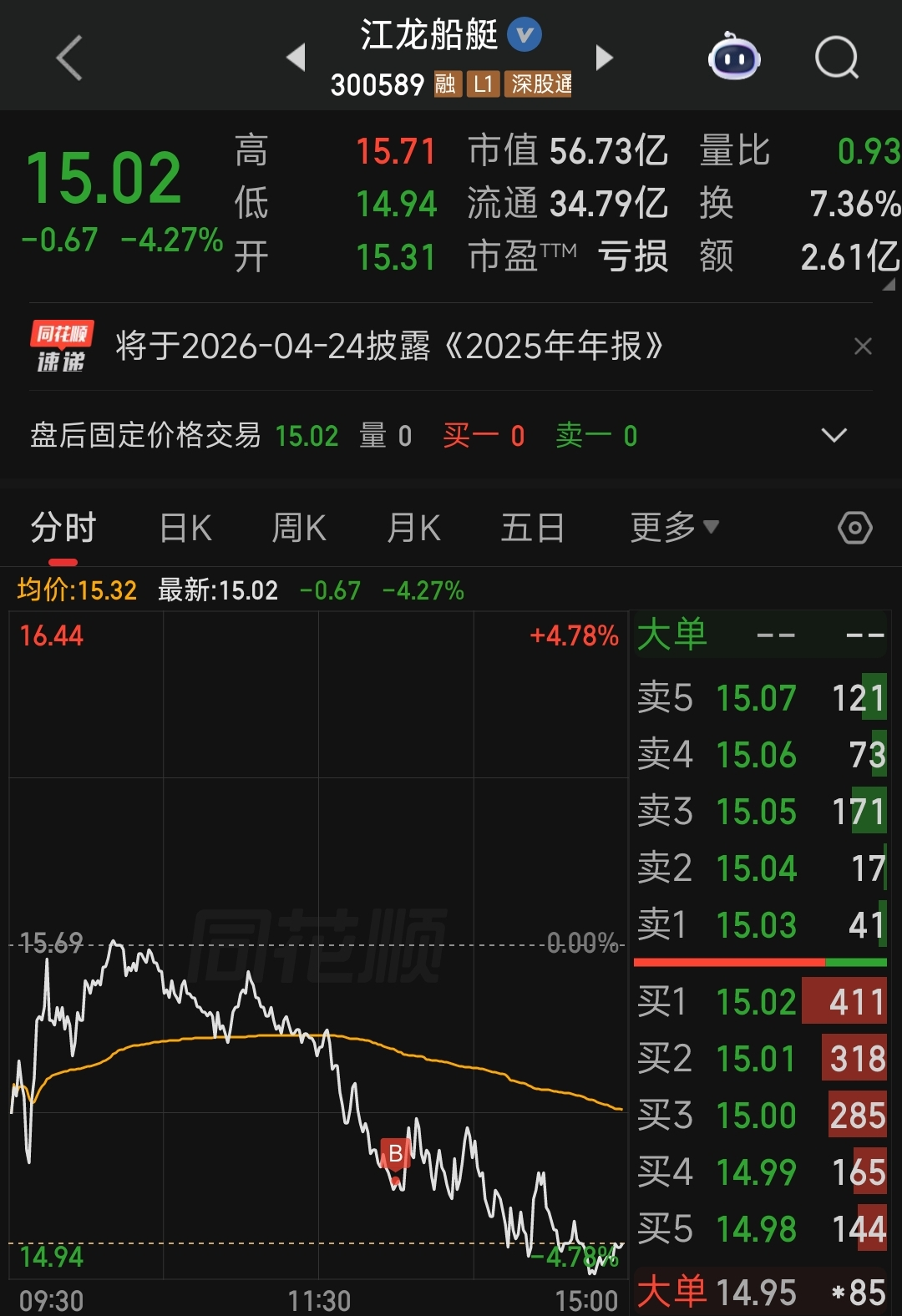 2、江龙船艇,早盘一度拉红的,也是被大盘带下去了,不说技术面了,只讲情绪,没说的,下午抽空看了一下盘面后,继续15.15按照做T三买条件低吸了一把。