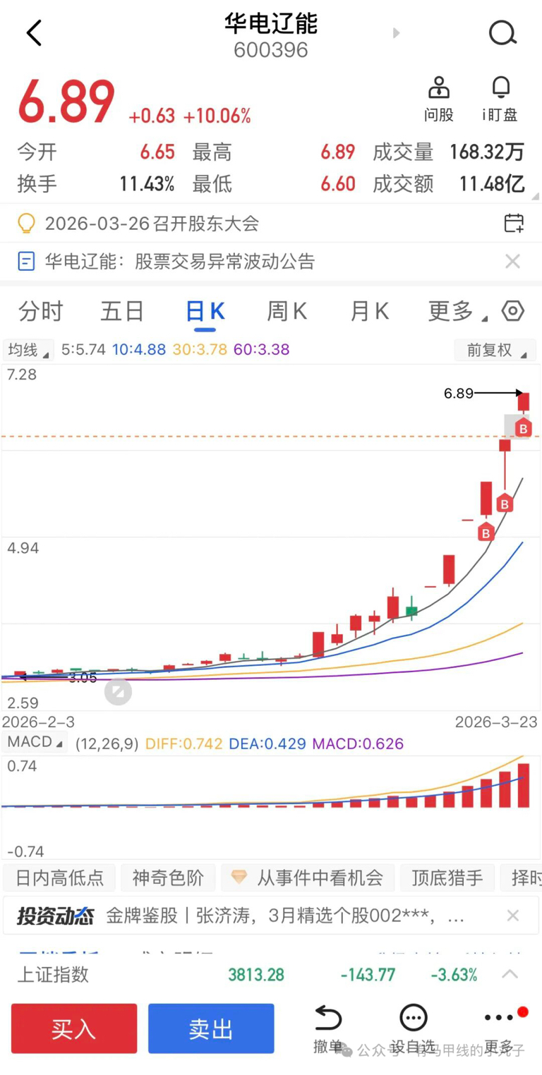 绿电的空间板,周五烂板。但有深华发和韶能的一字助攻,换手回封五板,看出了后两者都是工具人给辽能做嫁衣,所以周四小仓位试错,周五继续加仓。今天竞价,我心里预期是只要高开带量(1.2到1.5亿)开盘有承接就加仓。竞价结束1.3亿高开6个点符合预期,加上深华发工具人属性直接让位,就喊小伙伴们果断加了辽能。昨日复盘讲了,绿电是算电的延续,属于豫能周期,豫能只要不下杀,哪怕横住即可理论上就可以放心做华电辽能、东方新能。本着有新不做旧的原理,做绿电比前期的算电性价比高。辽能明天冲击七板,不管有没有资金愿意去封死七板,它也算走出了龙头抱团的破局属性。
