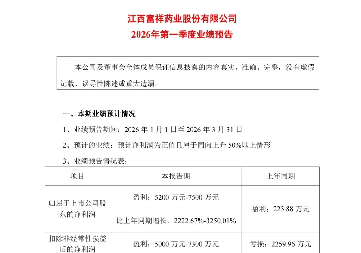海闻社观察 3月23日晚间,富祥药业同时发布了两份财务报告:一份是姗姗来迟的2025年业绩快报,另一份则是2026年第一季度的业绩预告。