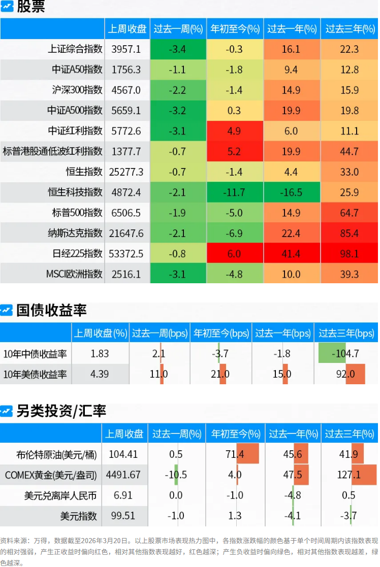 上周以美伊冲突持续,且因伊朗及部分海湾周边国家能源设施遭到破坏,能源价格再次上升,以及包括美联储在内的四大成熟市场央行议息会议均保持利率不变,利率或维持在现有水平更久的预期下,市场延续风险趋避格局,海外主票股指上周均震荡收跌:上周标普500指数下跌1.9%,MSCI欧洲指数下跌3.1%,日经225指数下跌0.8%。