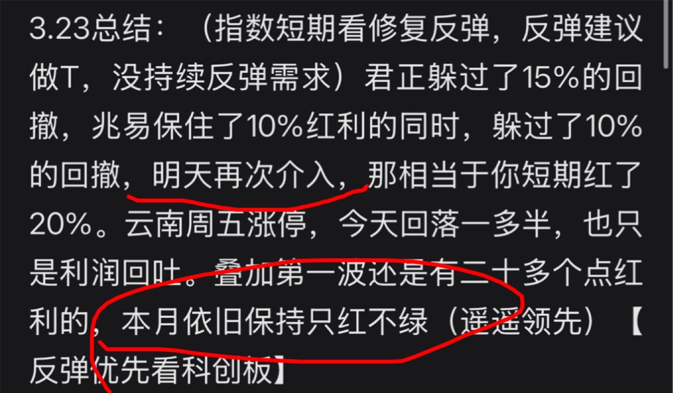 3.24总结:大家赚红利很困难是因为节奏没踩对,君正兆易低开高走,符合昨天总结预期,云南再次涨停也符合坚持预期。(君正第二波失败,无亏无盈)(兆易第一波10%落袋,今天抄底未算)(云南两波接近40%)整体50%附近。(我说过,参与调整是应该的,但是调整过后没反包那就是自己的问题了)。