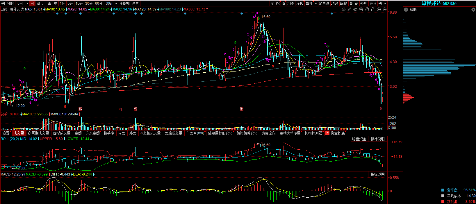 从筹码峰看,上方压力巨大,底部筹码密集区还处于萌芽状态。