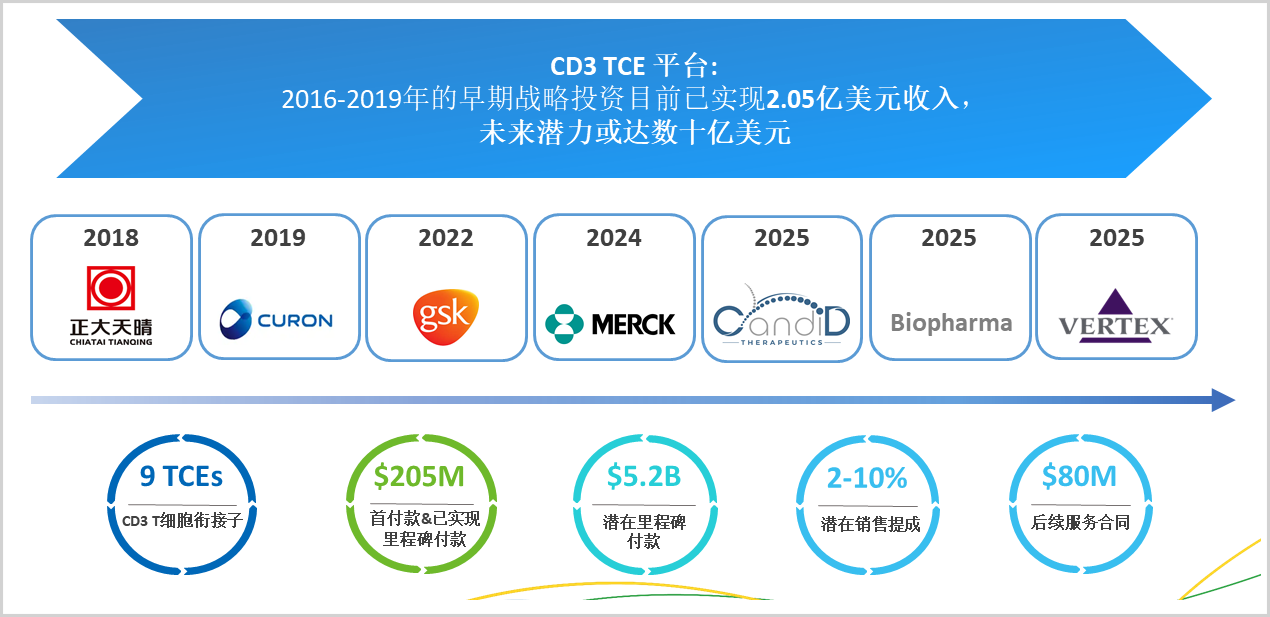 迄今为止,药明生物的CD3 TCE平台,已获得跨国公司和中国生物制药公司的广泛应用,包括Vertex、默沙东、GSK、正大天晴等。这一平台2016-2019年的早期战略投资目前已实现超2亿美元收入。