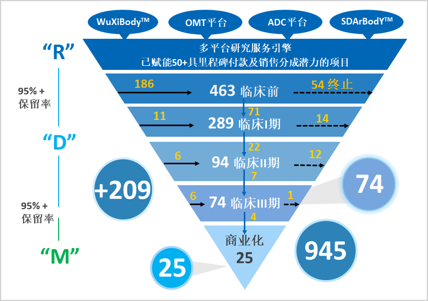 无论跟随或赢得的分子,在药明生物CRDMO平台内有序推进,形成独特的“黄金漏斗”。当各类分子沿着R-D-M路线,一路向后期推进,其价值也在不断放大。
