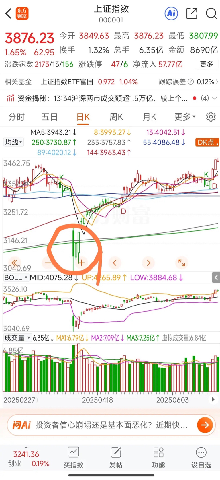 那么今天大盘算止跌企稳,底部确认成功了吗?从今天的成交量来看,稍显不足,应该还有可能进行三次确认,但是今天的力度还算不错,再确认的话,大概率没麻搭,如果外围情况好的话,不排除稍稍调整就直接上去的可能,我们再来看看20250409的走势(如截图圆圈内),大盘也是三次去确认了一下底部支撑,但没有击破前低,那么明天大盘也会去三次探底吗?还是稍稍调整一下就向上反弹呢?且听我明天早评再详细分解。昨天收评我提到低点目标已达到,最昏暗时刻已经过去,并希望大盘以233日线上方止跌后做为新的起点,开启下一波行情,至少从今天的走势看,希望和期望及预判都可能成为现实。
