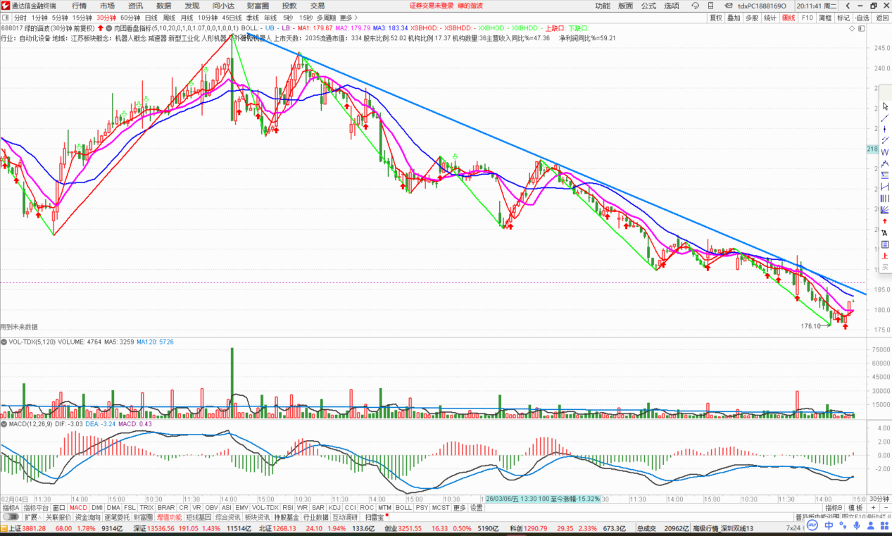 $绿的谐波(SH688017)$长线龙头+短期利好催化+机器人减速器。30分钟下降结构已经明显趋缓,并且昨天的冲高回落和今天的探底回升已经形成了一个小的“揉搓试盘线”,一旦这里有突破30分钟下降趋势走势的动作,就是我们中长线加仓的信号,耐心等待即可。