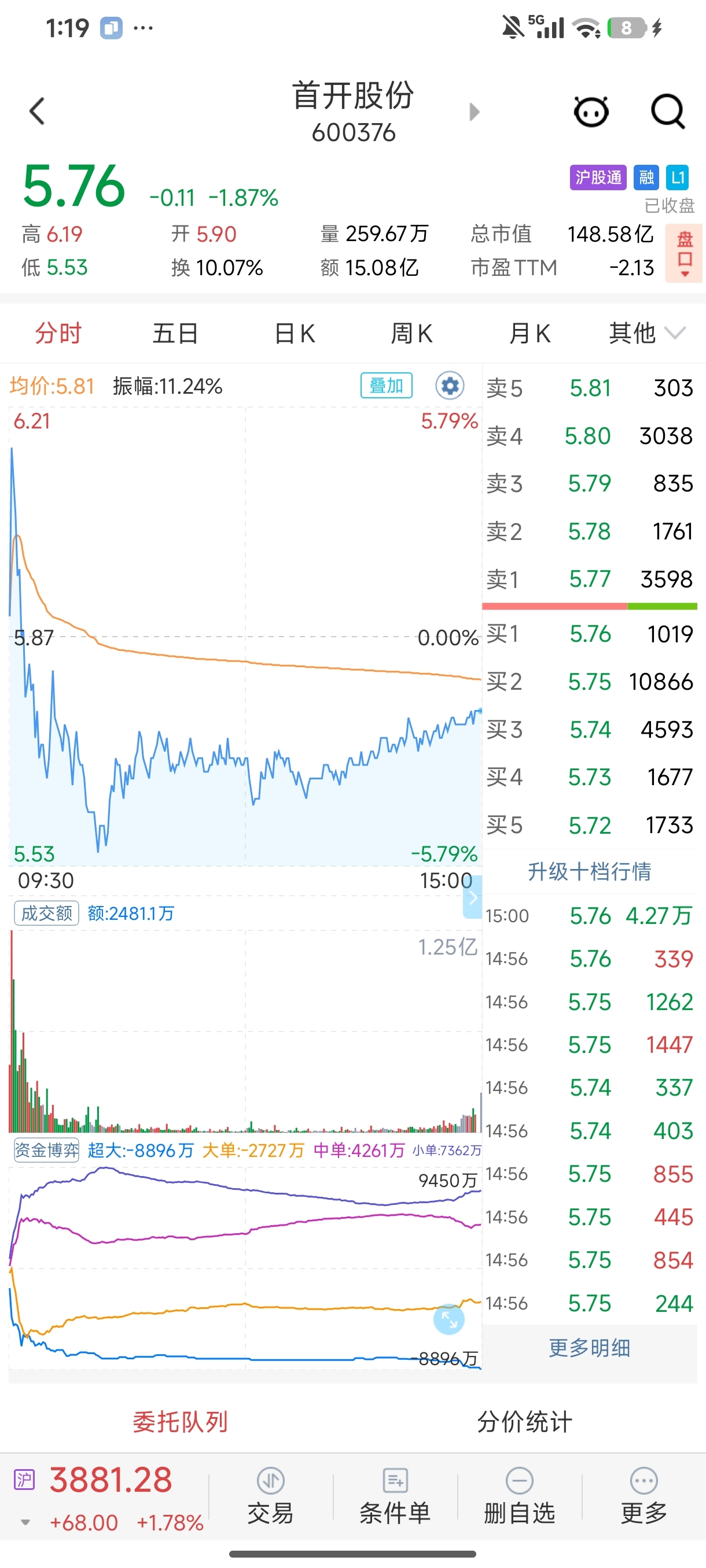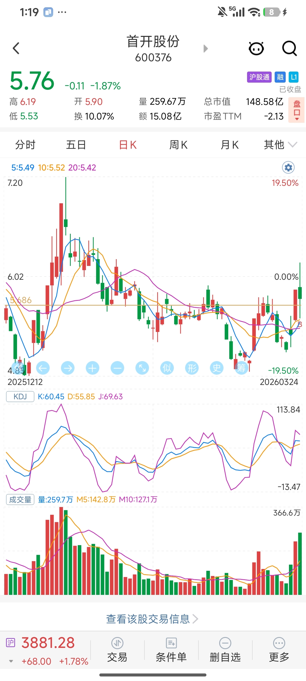今日冲高回落,吸了点筹码,明天吃肉!$首开股份(SH600376)$