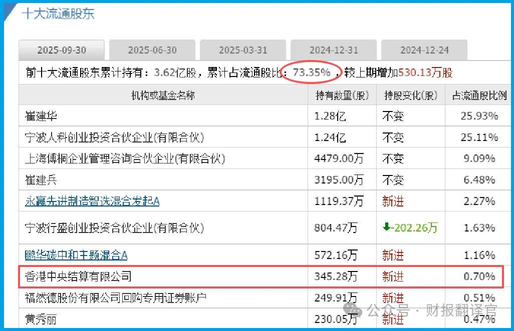 我是财官,深夜翻到一份财报,福然德前十大流通股东握住了73.35%的筹码。市面上能交易的份额,只剩下不到三成。$福然德(SH605050)$