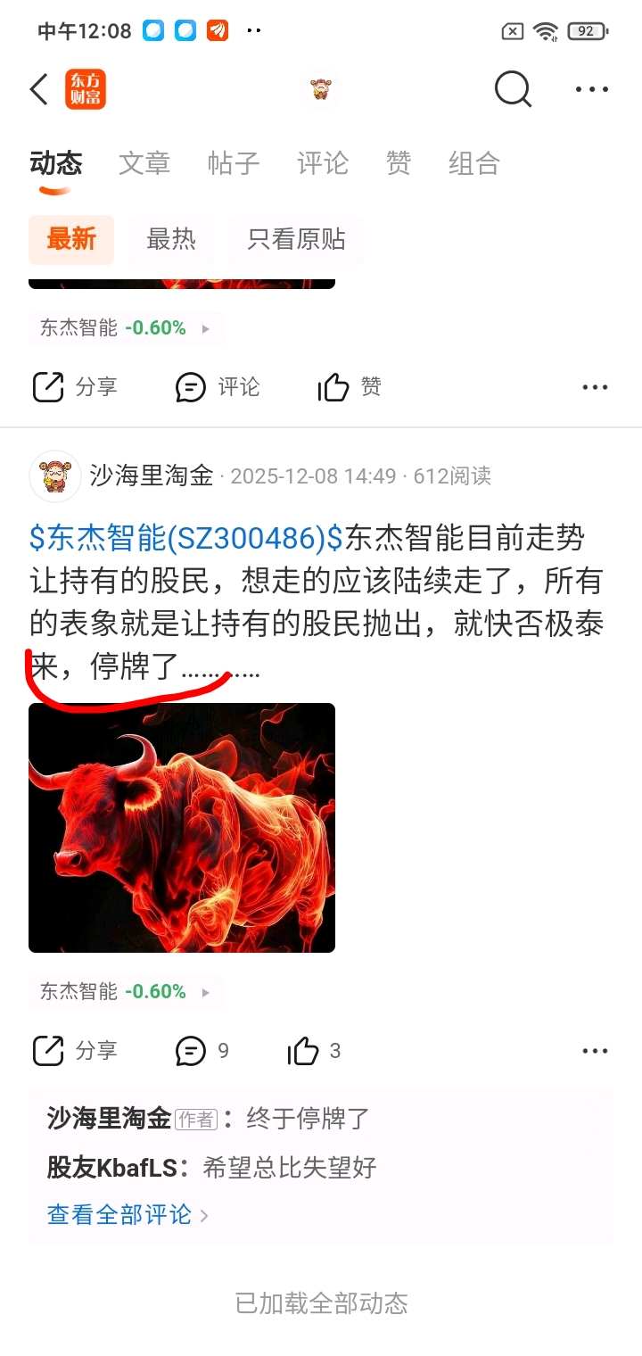 $东杰智能(SZ300486)$ 主号又开始不顺畅了,还是小号来发吧,东杰智能又到了可能会停牌的关键节点,虽然概率不足三成,但还是有这个概率的,就看运气如何了?12月16日前预判停牌关键节点是预判对了,可惜并购遨博终止复牌,真的是意想不到。同一天嘉美包装两根阴线调整,个人觉得见底反弹概率,周末特意发帖看多嘉美,回头来看又是对的。所以个人觉得,目前东杰智能股价已经砸下来了,就有再次停牌重组概率了,本周不停牌的话,介入的资金下周开始就又会拉高出一部分货,随着价格再次回落,介入的资金又会逢低接回筹码,到4月下旬完全接回筹码,继续控盘控价等待年报过后下一个交易日后停牌节点。以上纯属个人猜测,切勿当真!
