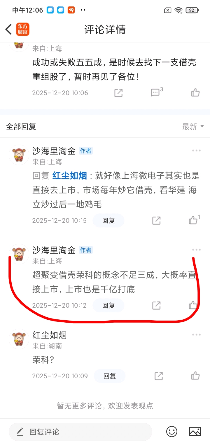 本人去年8月份东杰智能停牌期间,有和群友及伙伴们说了,做好东杰后,准备10月18日做超聚变借壳概念股荣科科技或另外一支股,但事与愿违,东杰智能复牌大失所望,我自己也就没去做荣科了,但有少数伙伴1018日左右去做了,12月份9日10日我有和他们聊,说荣科借壳概率不大不足三成了,荣科科技大概率是自己独立上市,之后多次有聊这个问题,并告知他们既然可能要去独立上市,那肯定会再次拉高出货,择机抓紧清仓别犹豫了,大多都信了,跑了,个别的不信亏了不少!