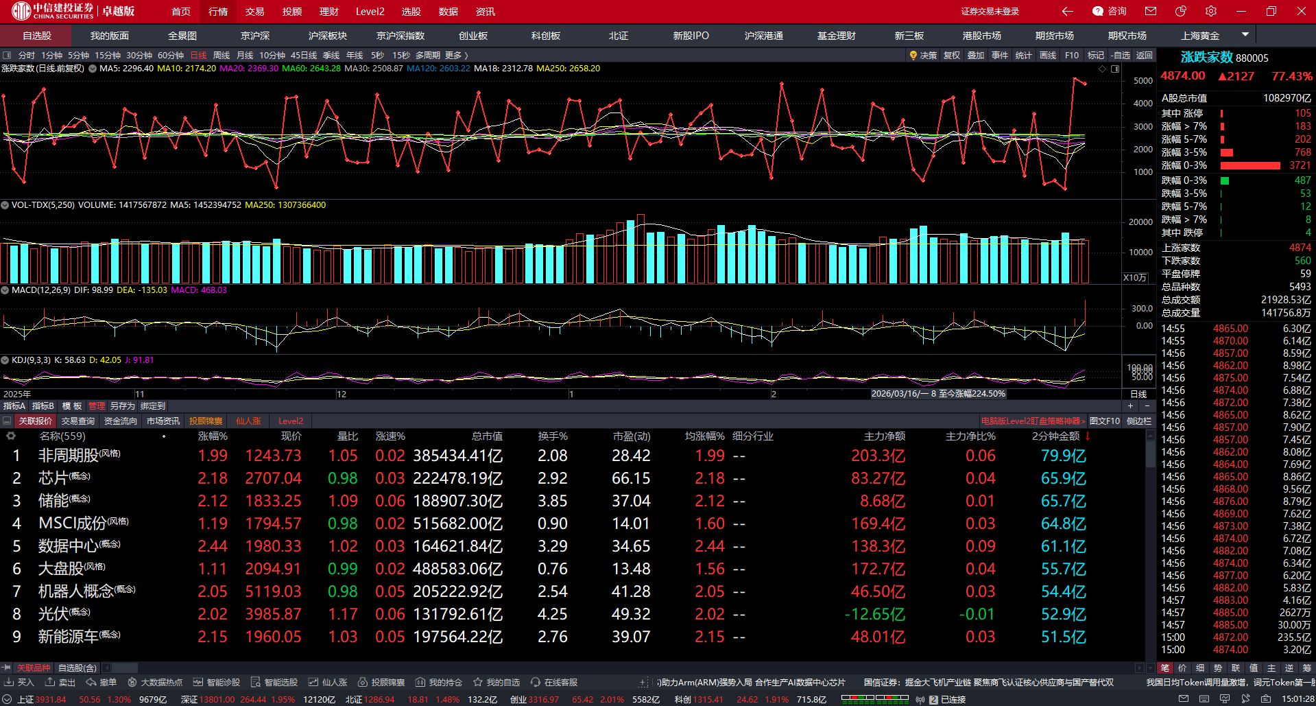 周二周三连续俩天普涨,我想问一句,周一抄底博弈冰点修复的兄弟,你们落袋为安了吗?俩分钟复盘今天盘面以及对明天行情的应对方案。首先第一,昨晚美股是大跌的,但今天收到亚太市场大涨的环境下,我们这边也是超预期的高开高走。那么俩天的强修复下,从均线上来看,五日线目前是收回了,但是缺口还并未补齐,从涨跌家数的沸点来看,已经连续俩天高潮,第三天继续普涨的概率我认为并不会很大,美股纳斯达克目前承压还是明显的,这个位置很有可能还会向下延续下跌趋势。那么对照我们的市场上,很可能会二次回踩确认低点之后再拉起去补掉周一留下的跳空缺口。那么回到五分钟的技术层面上来说,昨天是构筑了一个一分钟次级别中枢之后今天向上走离开段,那么主观预期上来说,明天确实还有向上冲高的预期,但是仅限于给今天尾盘没有及时落袋为安的兄弟一个跑路的机会。如果明天早上又是开盘直接4000家上涨,那么越临近4000点这个位置,越要当心,小心回踩一脚大的,那么利润将会再次回撤。明天如果说回踩不进3906,那么3b点成立还能继续往上去把缺口补齐,如果说回踩进来了,并且破掉了3866。回抽不上去,那么主观预期就是二次去确认前低附近,或者去回踩3740附近,然后指数才有可能短期见底之后向上缓步修复,所以当下指数环境是复杂的,调整并未结束,前期控仓周一抄底的,有利润,要及时的落袋为安,才是自己的,否则如果二次确认底部的话,一起被套里面就不是很好了。如果今晚纳斯达克是收阳线,那么明天早盘的预期应该是向上冲做一个小级别的背离高,(也是跑路的机会)但如果今晚纳斯达克继续大跌的话,明天低开就按照方案计划着来。