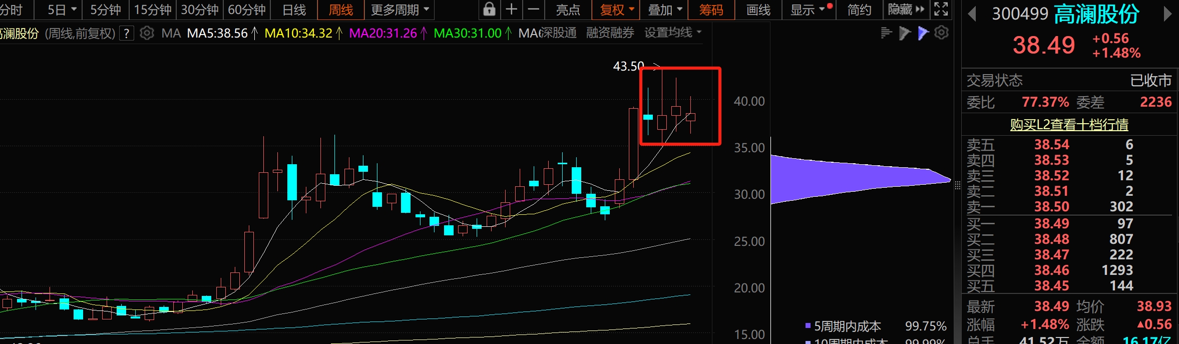2、$高澜股份(SZ300499)$ 高澜股份:日线大号十字星,周线四连星,不管是洗盘还是出货,也差不多在这里了,其实高澜的弹性是真的好,不管是短线还是中长线的,只需要关注一个位置,36.5就行了,都不用管那么多,买了就是安心。顺带说一下今天跳水,没啥大问题,缩量跳水,比英维克出了一天的货都要强很多。