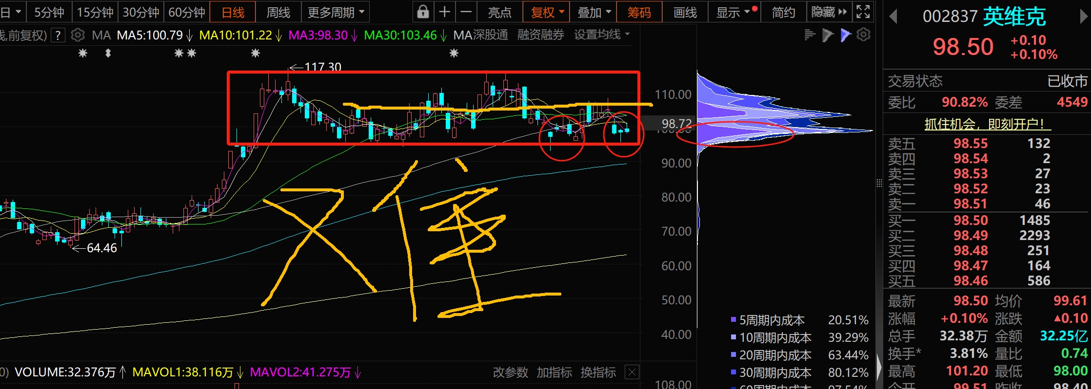 1、英维克:整体还是太弱势了,今天直接大涨1毛钱(0.1%),说实话1毛钱很多了,国足有时候1球都进不了,现在的英维克跟奥尼尔站上罚球线基本是一样的,一分难求。今天的三根K线,老手都是知道的,组成了下跌中转站,但是,爽哥我觉得明天还会有一次机会,机会在于今晚的英伟达和维谛技术是否向上打开空间,这是唯一的救赎。丧气话不多说了,大家买了这个都压力挺大的,我100.8出底仓,但是早上100.3追的也被埋了,全球都在涨,英维克机构一直降维打击,taco我????