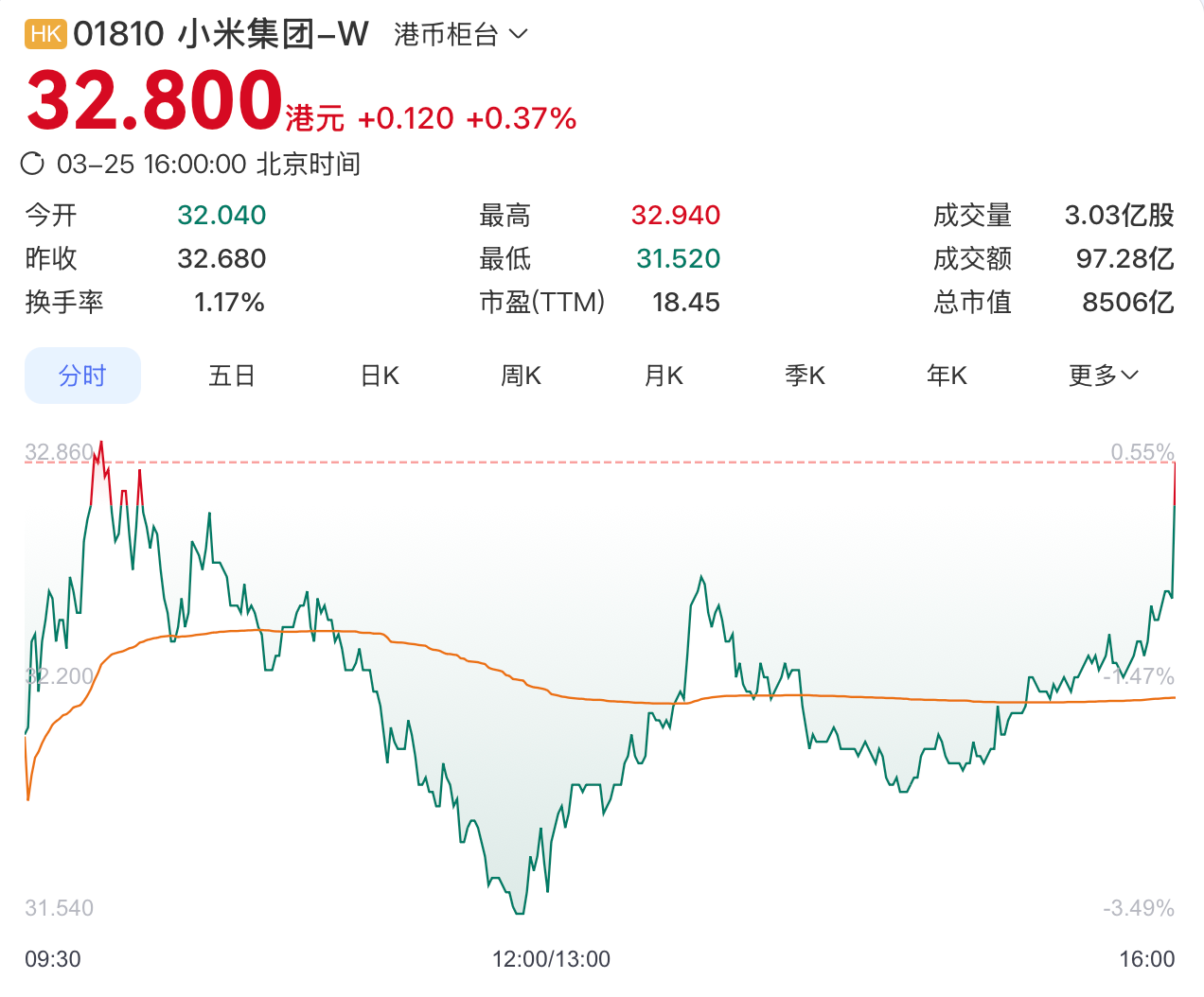 此次亮眼年报的发布,也没能大幅扭转颓势。今日,小米微跌开盘,盘中短暂回升后,开始震荡下行。截至收盘,小米微涨0.37%报32.8港元,总市值8506亿港元。