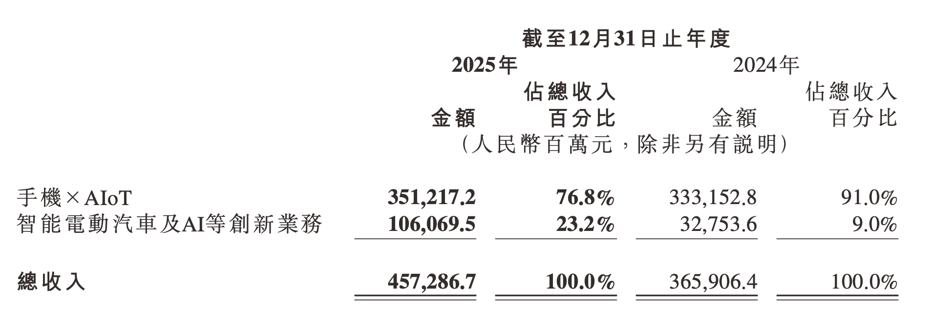 2025年报显示,小米汽车的交付量约41.11万辆,同比增长200.4%。伴随更高端的Xiaomi SU 7 Ultra及Xiaomi YU 7开启交付,小米汽车ASP(平均销售价格,Average Selling Price)由2024年的每辆23.4479万元上升7.1%至2025年的每辆25.1171万元。强劲的销售表现,直接带动小米智能电动汽车收入,由2024年的321亿元增加221.8%至2025的1033亿元,毛利率则由2023年的18.5%上升至2025年的24.3%。