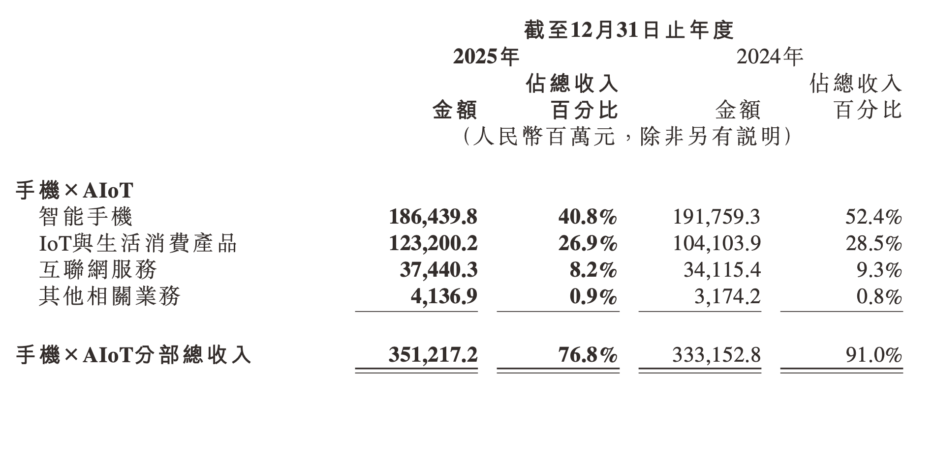 2025年,小米的“手机×AIoT”分部收入为3512亿元,创历史新高,同比2024年的3332亿元增长5.4%,毛利率达到历史新高的21.7%,同比增长0.5个百分点。然而,拆分来看,2025年,小米手机的收入为1864亿元,同比2024年的1918亿元减少2.8%,毛利则从2024年的242亿元降至2025年的203亿元,减少近40亿元。