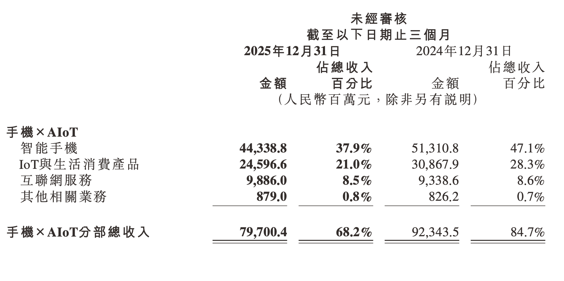 再来看2025年Q4,小米手机×AIoT分部收入由2024年Q4的923亿元减少13.7%至797亿元,环比2025年Q3的841亿元减少5.2%。