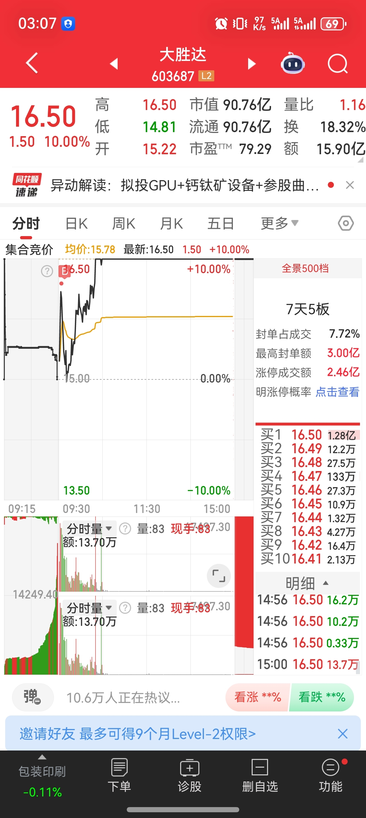 大胜达:今天资金拉了包装,大胜达新高板介入。