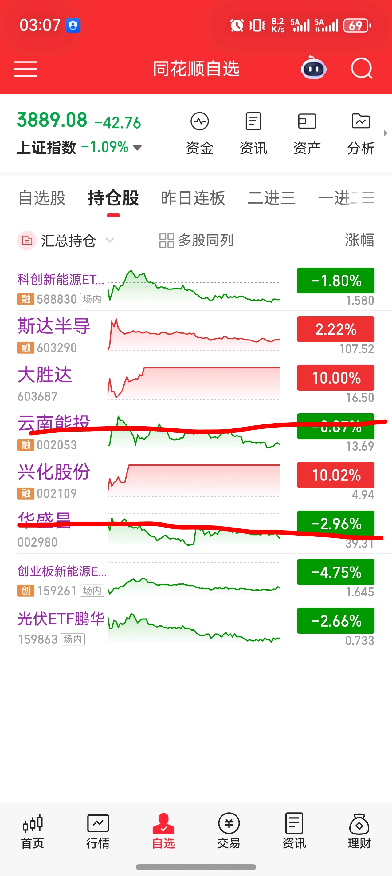 今日沪指低开低走跌1.09%,失守3900点整数关口,两市成交额缩量超2000亿跌破2万亿,全市场近4500只个股下跌,赚钱效应降至冰点。盘面呈现高低切换,算力、光伏、保险等前期强势板块成杀跌重灾区,仅绿电、锂电等低位板块逆势走强。电力板块虽迎来首次弱分歧,但仍是市场最强主线,涨停家数居首,油气等板块仅为外围消息刺激的轮动行情,持续性存疑。连板晋级率随大盘调整显著走低,华电辽能盘中触及9板,后续进入纯筹码博弈阶段。操作上兑现湖南发展等标的,新进大胜达等个股,明日将重点观察华电辽能走势,围绕电力分歧预期制定策略,当前阶段优先控制仓位,等待指数明确企稳信号。