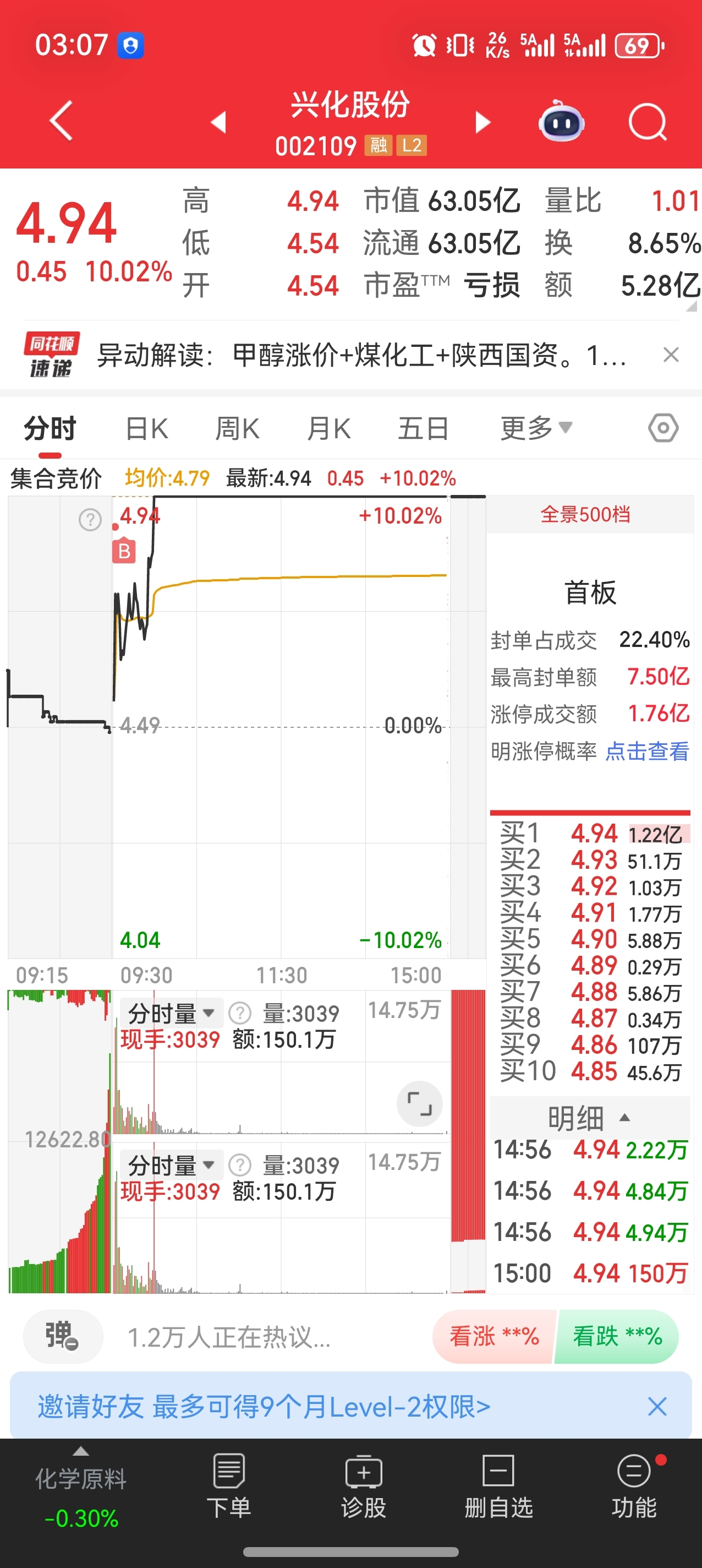 兴化股份:渤海化学秒板,兴化股份大单拉升介入。
