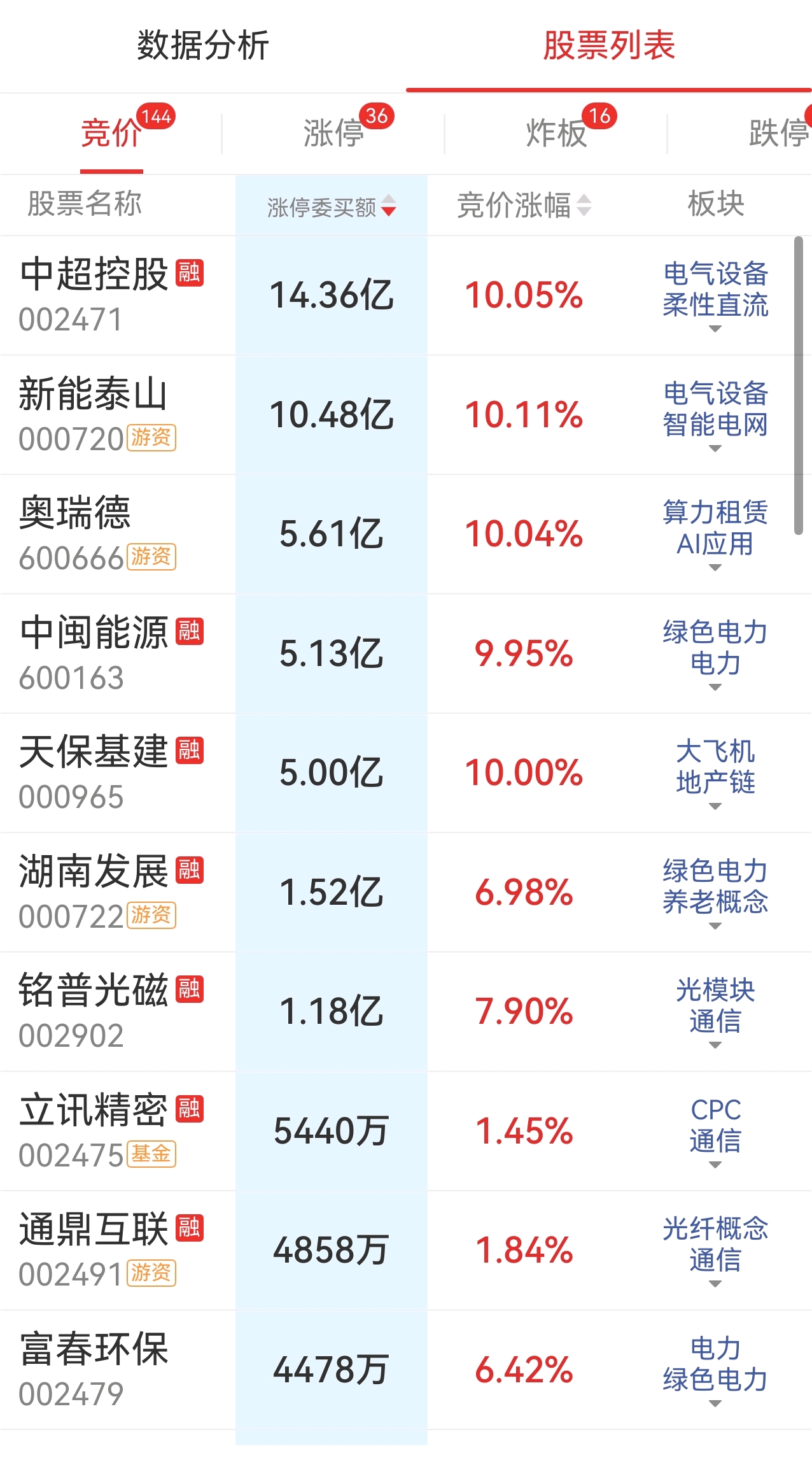 新增一字板:中超控股、中闽能源、天保基建